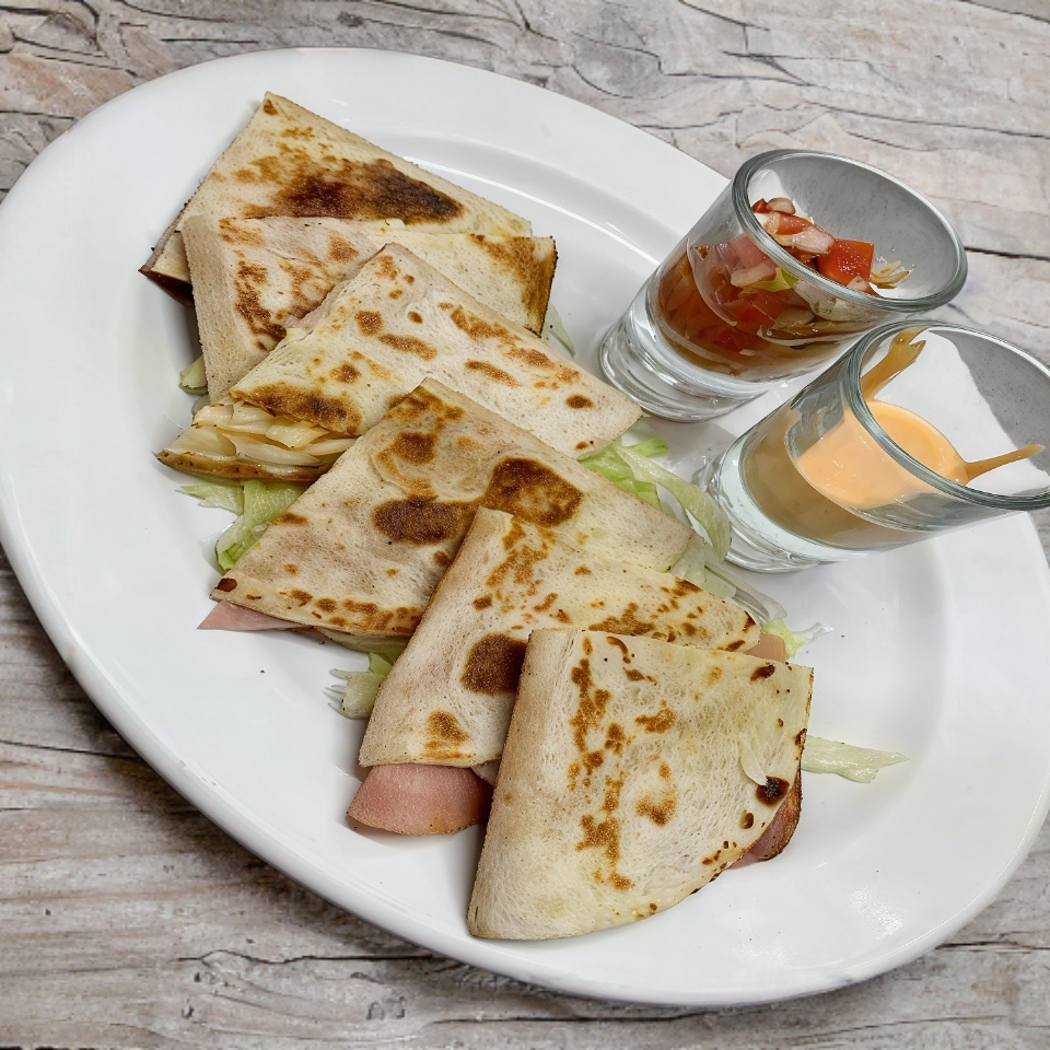 Tortilla de harina, con queso manchego y jamón, guarnición de romanita, acompañada de aderezo y salsa mexicana