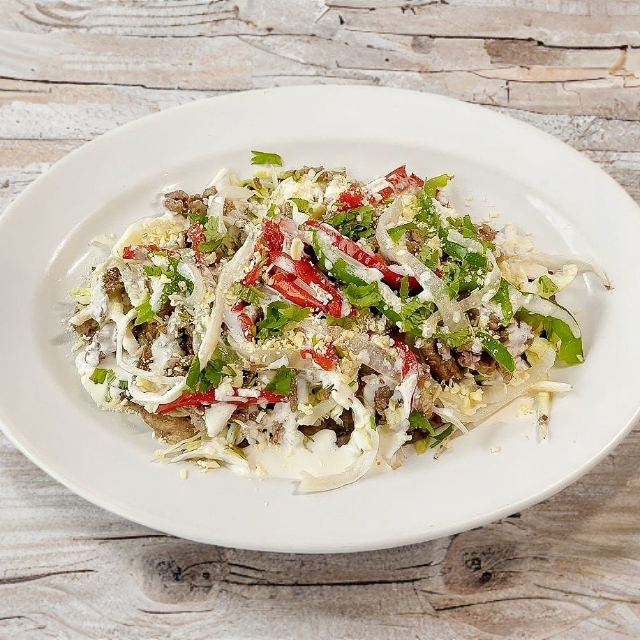 Huarache hecho a mano de maiz, dorado en la plancha acompañado de una cama de frijol, carne jugosa a la plancha, guarnición de cilantro, romanita, cebolla queso y crema.
