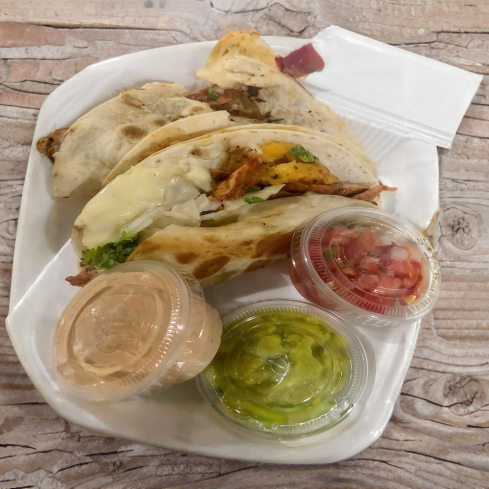 3 pzs tortillas de harina con deliciosa carne al pastor, piña, ,queso ,cilantro y aderezos