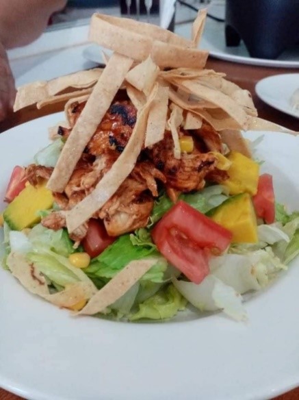 Deliciosa pechuga de pollo en salsa BBQ, sobre fresca lechuga, acompañada de aguacate, granos de elote, cubos de tomate y juliana de tortilla, aderezada con ranch