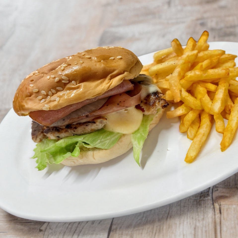 Pan de hamburguesa relleno de deliciosa carne de la casa con queso gratinado, jamón, tocino y ensalada fresca, guarnición de papas francesas.