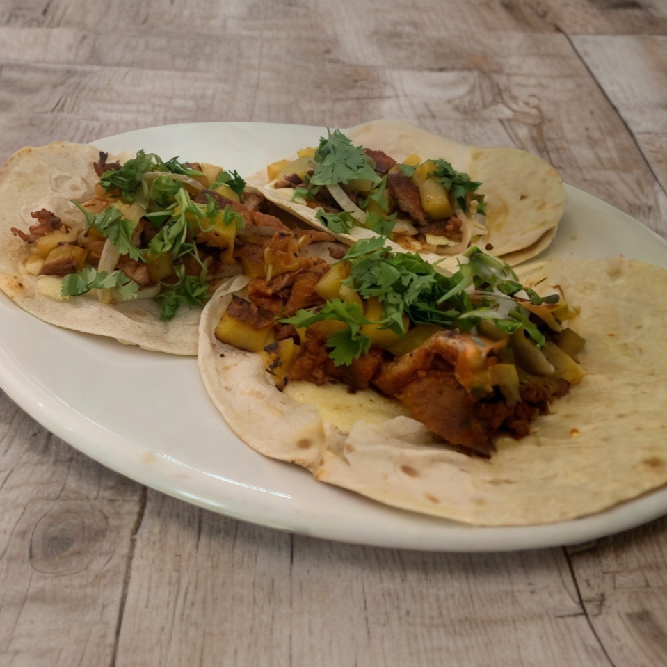 3 pzs tortillas de maíz con deliciosa carne al pastor, piña, cilantro y aderezos