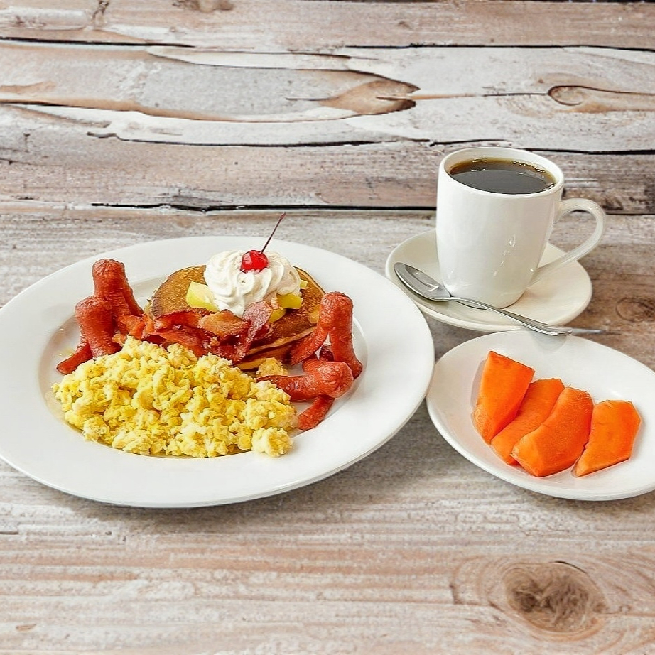 Huevos revueltos, acompañados de hotcakes y salchicha. Puede ir acompañado de jugo o fruta café o te