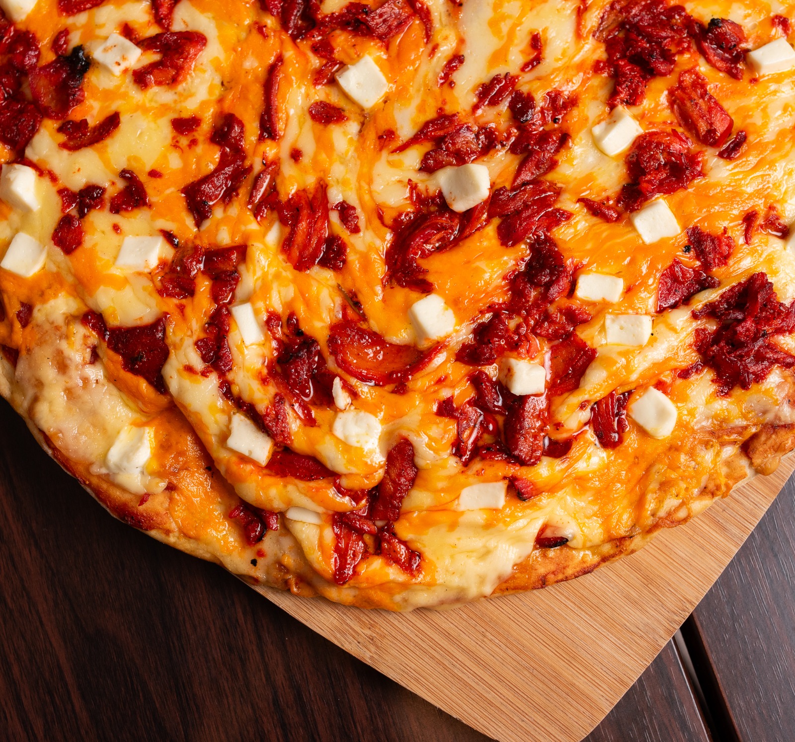 Pizza con base de cuatro quesos (mozzarella, chihuahua, Deysi y queso crema) y porción de carne al pastor.