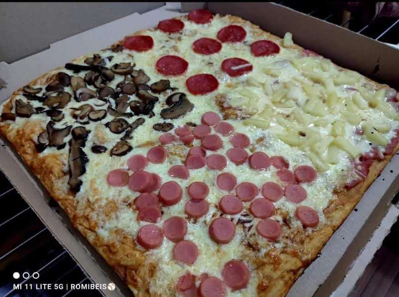 Pizza cuadrada dividida en cuatro cuadrantes: 1) peperoni, 2) champiñones, 3) hawaiana, 4) salchicha.