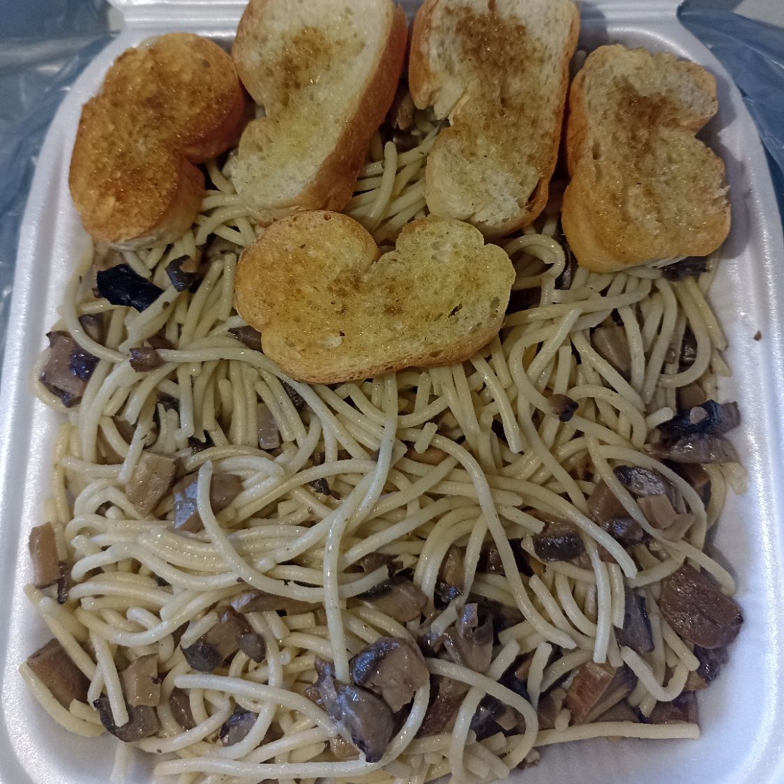 Con crema Alfredo y champiñones, acompañada de panecillos de ajo.