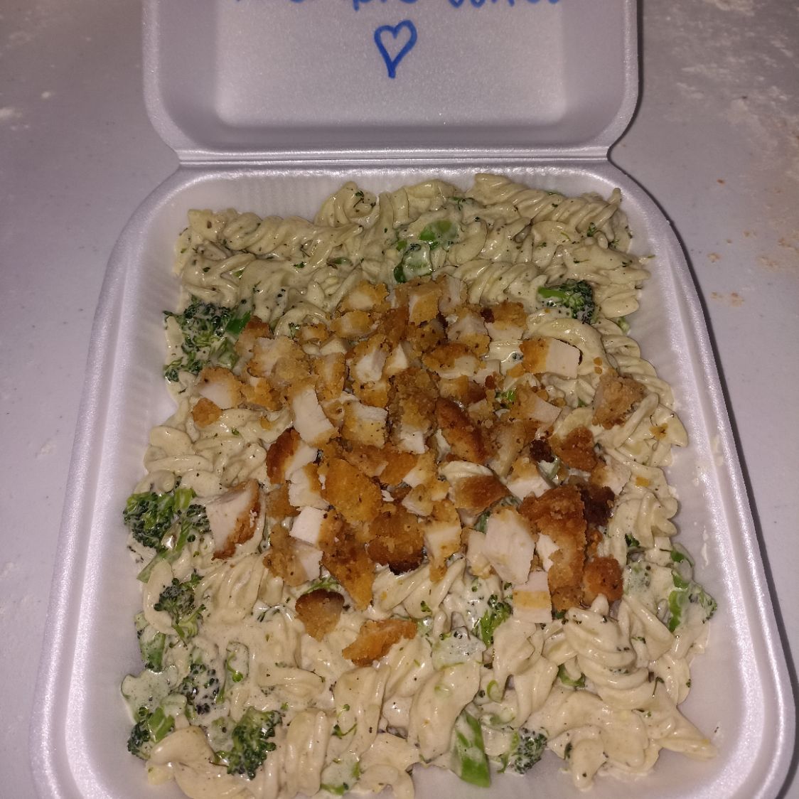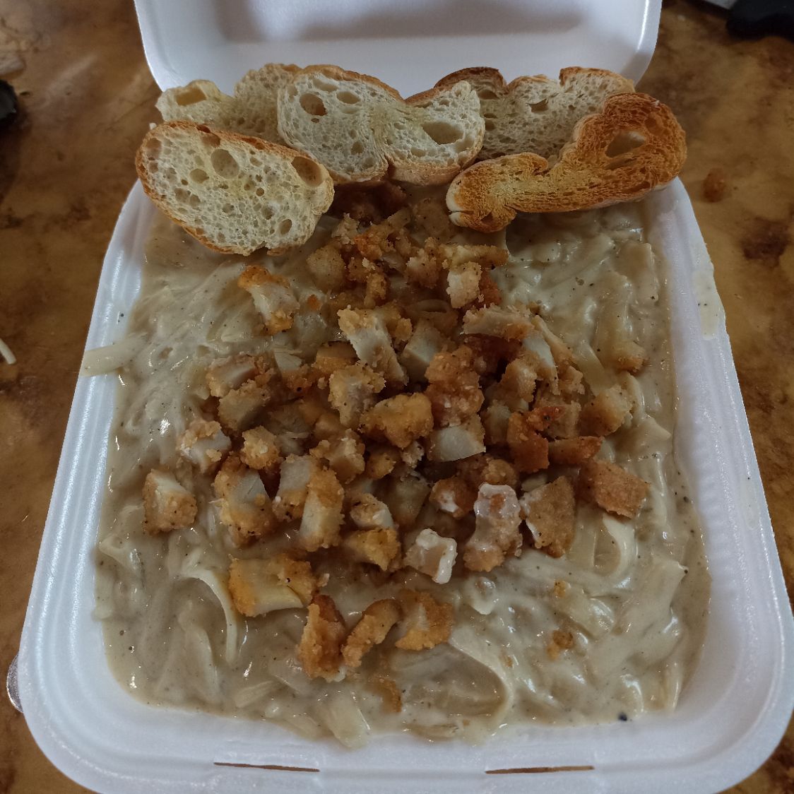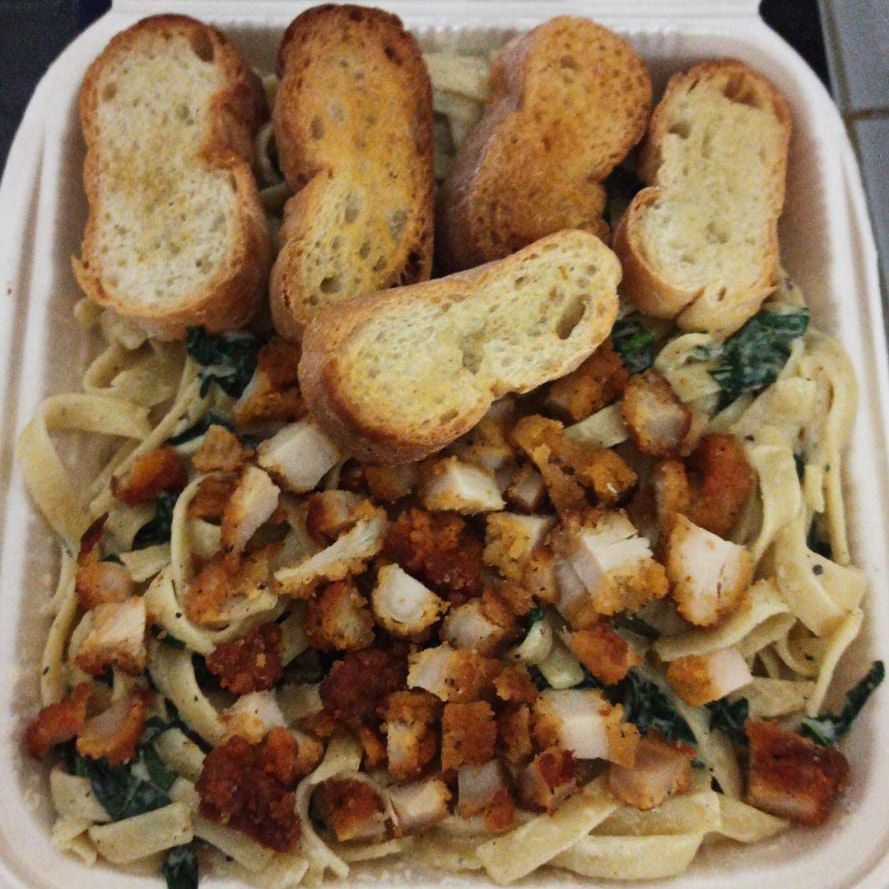 Con crema Alfredo, acompañada pollo empanizado y panecillos de ajo.