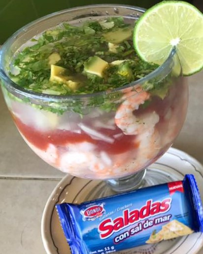 Camarones, limón, cilantro, chile serrano, chile habanero, cebolla morada, pepinos y tostadas.