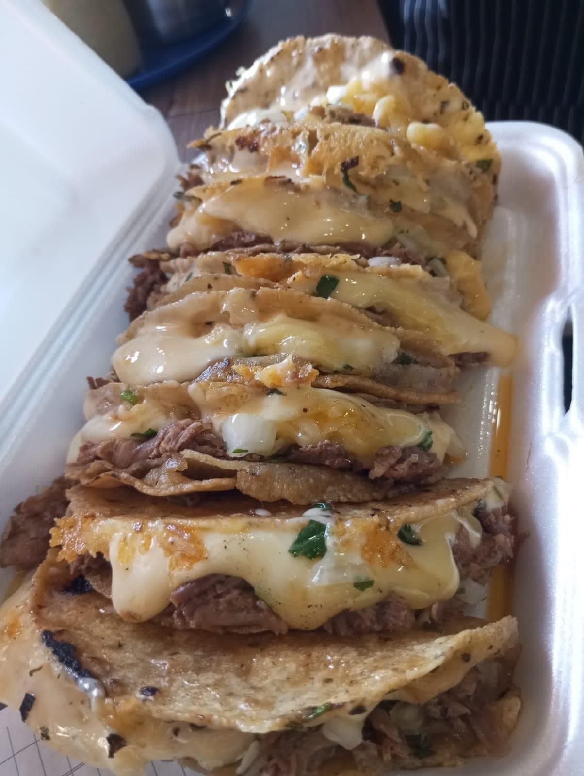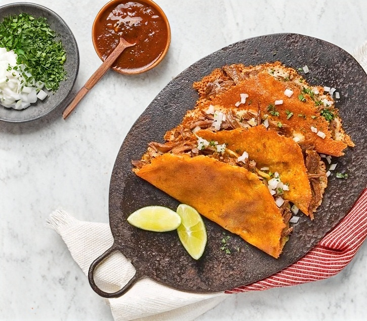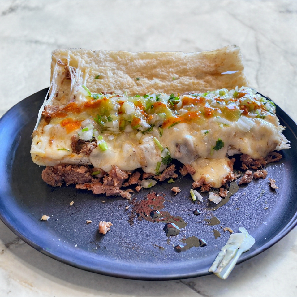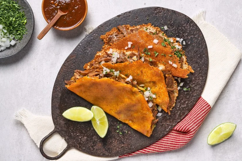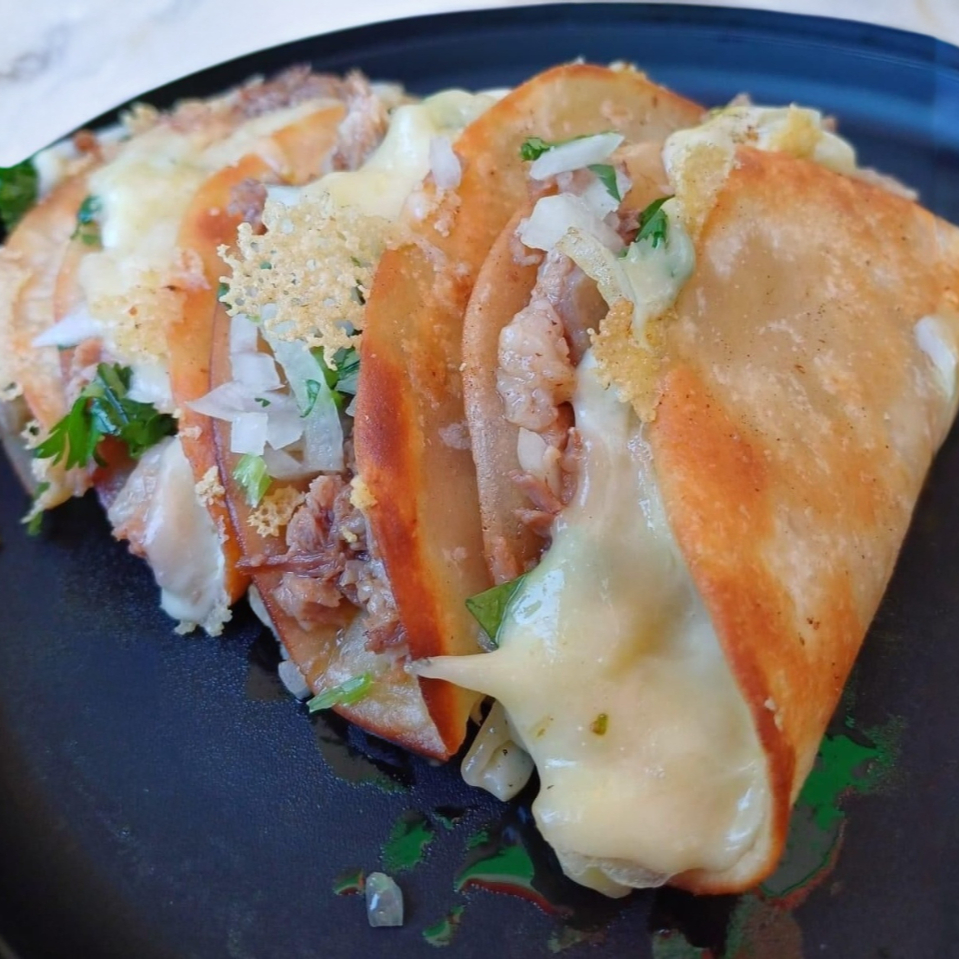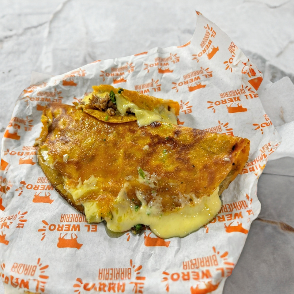 1 Quesabirria: tortilla rellena de birria y queso; por dentro lleva cebolla y cilantro. Se envían salsa roja, salsa verde y limón por aparte.