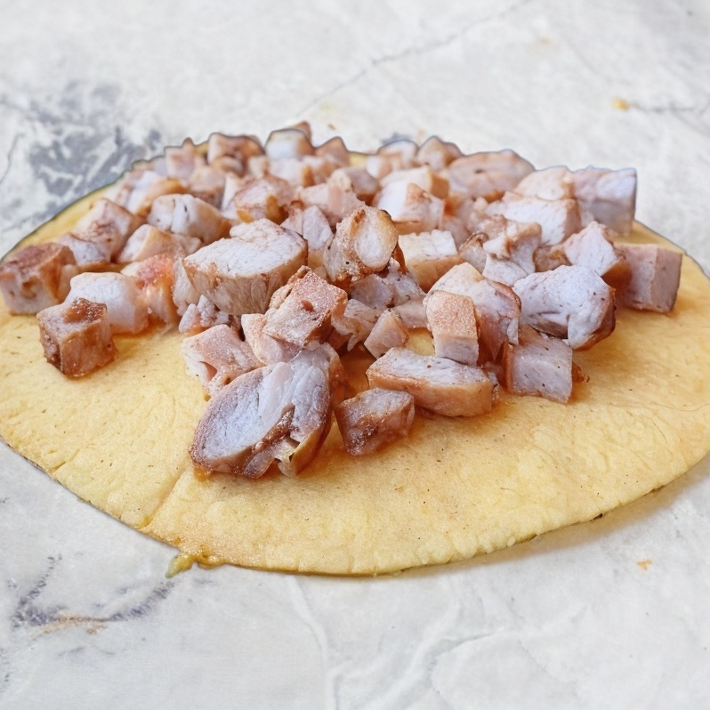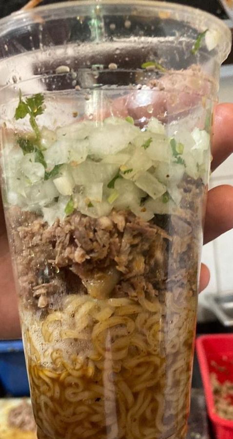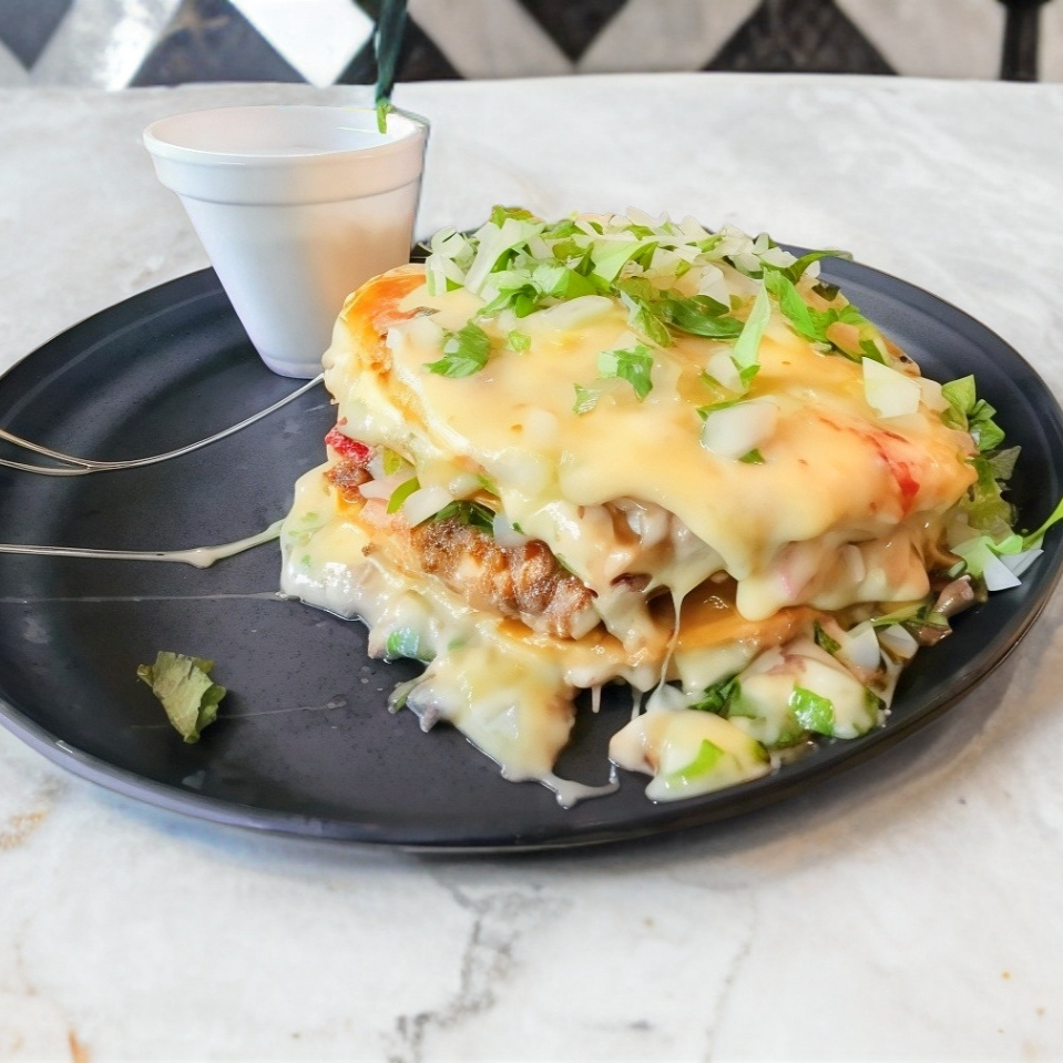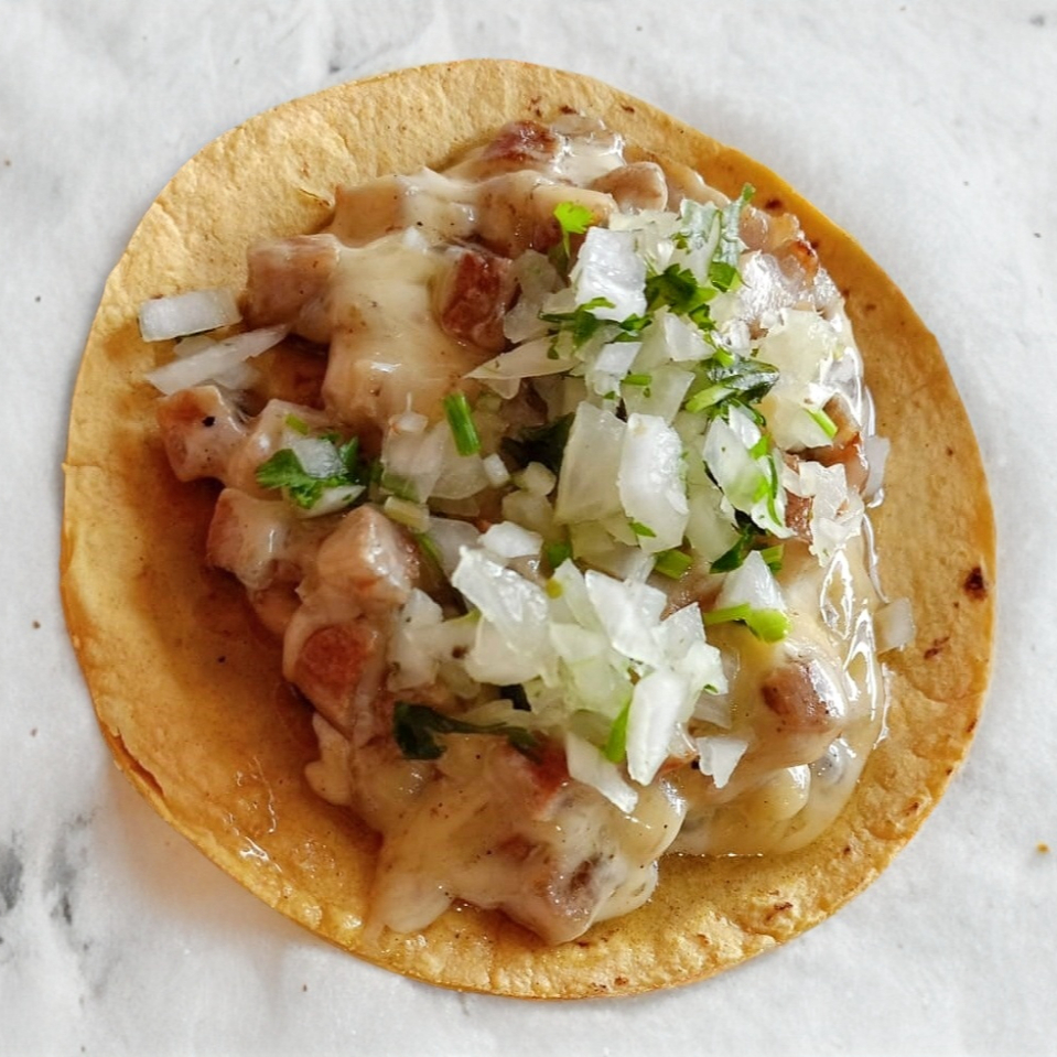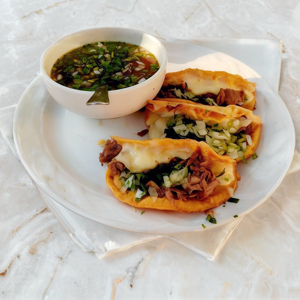 1 Quesabirria: tortilla rellena de birria y queso; por dentro lleva cebolla y cilantro. Se envían salsa roja, salsa verde y limón por aparte.
