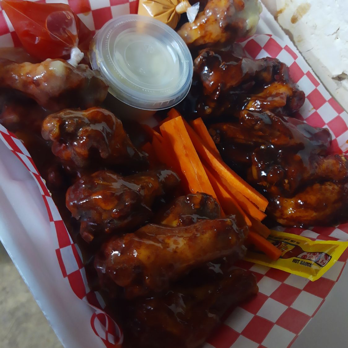 25 alitas fritas bañadas en salsa de su preferencia (2 a escojer), acompañadas bastones de zanahoria ,salsa ranch,capsu,picante orden de papas