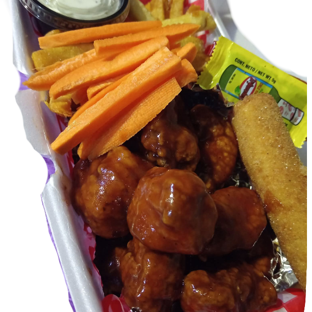 10 boneles, acompañado de salsa ranch, bastones de zanahoria, picante, 1 dedo de queso o 3 aros de cebolla