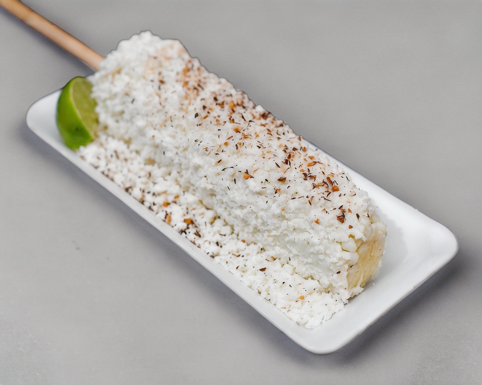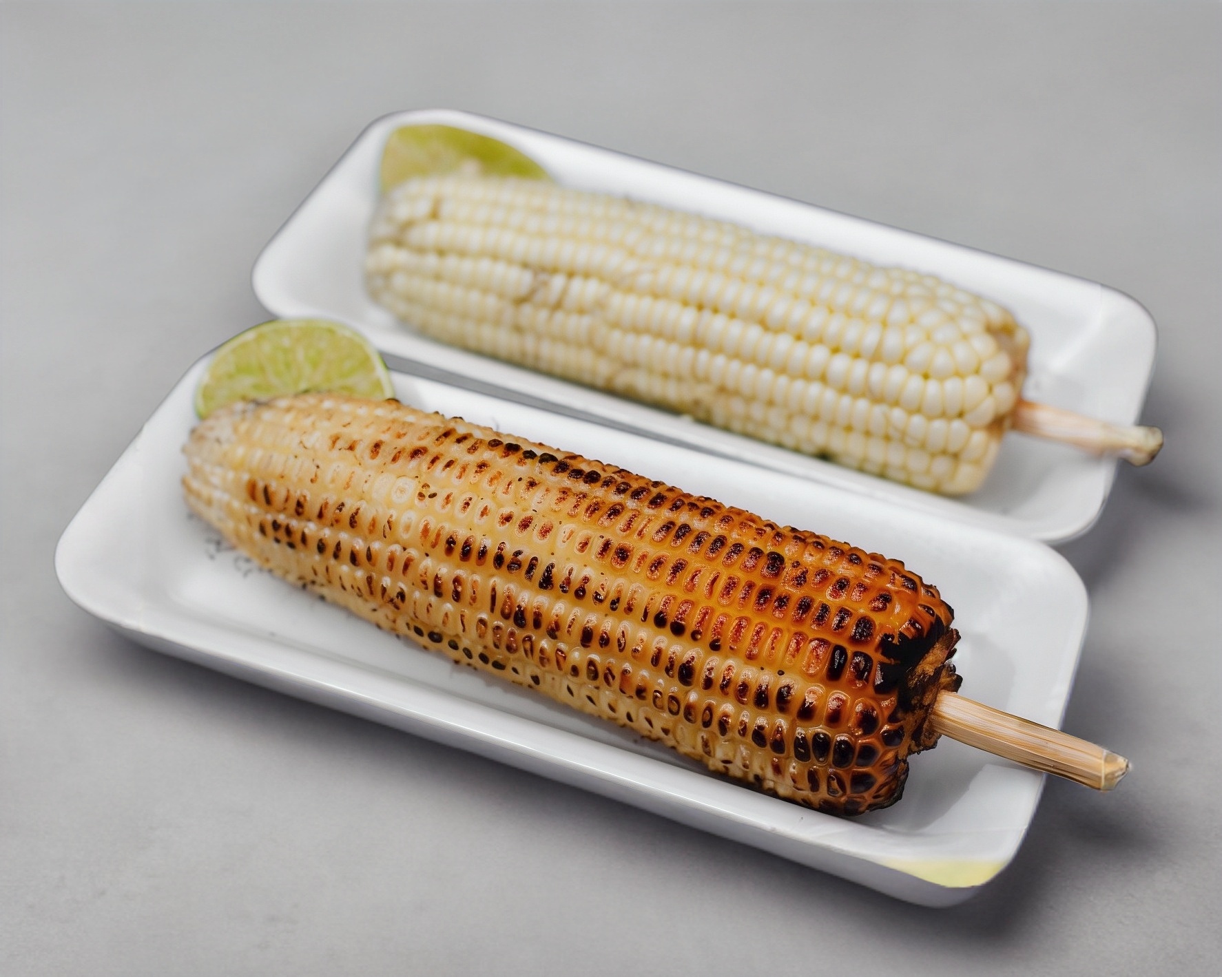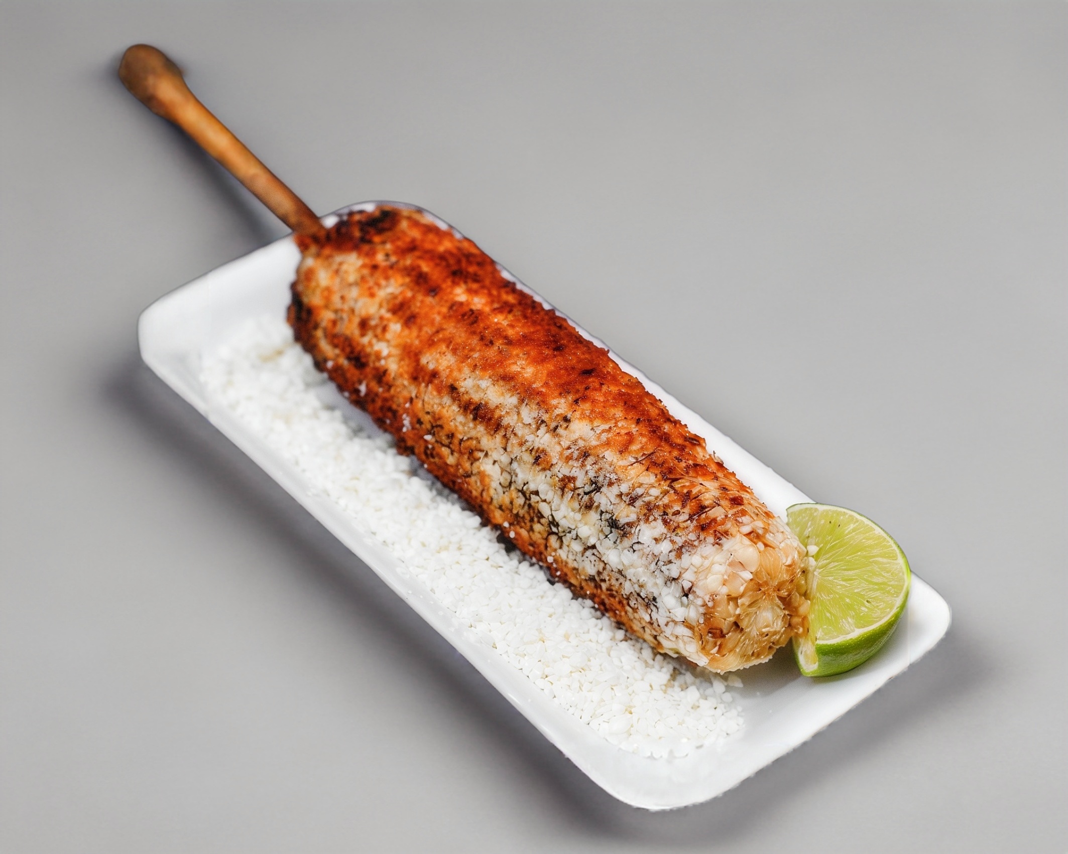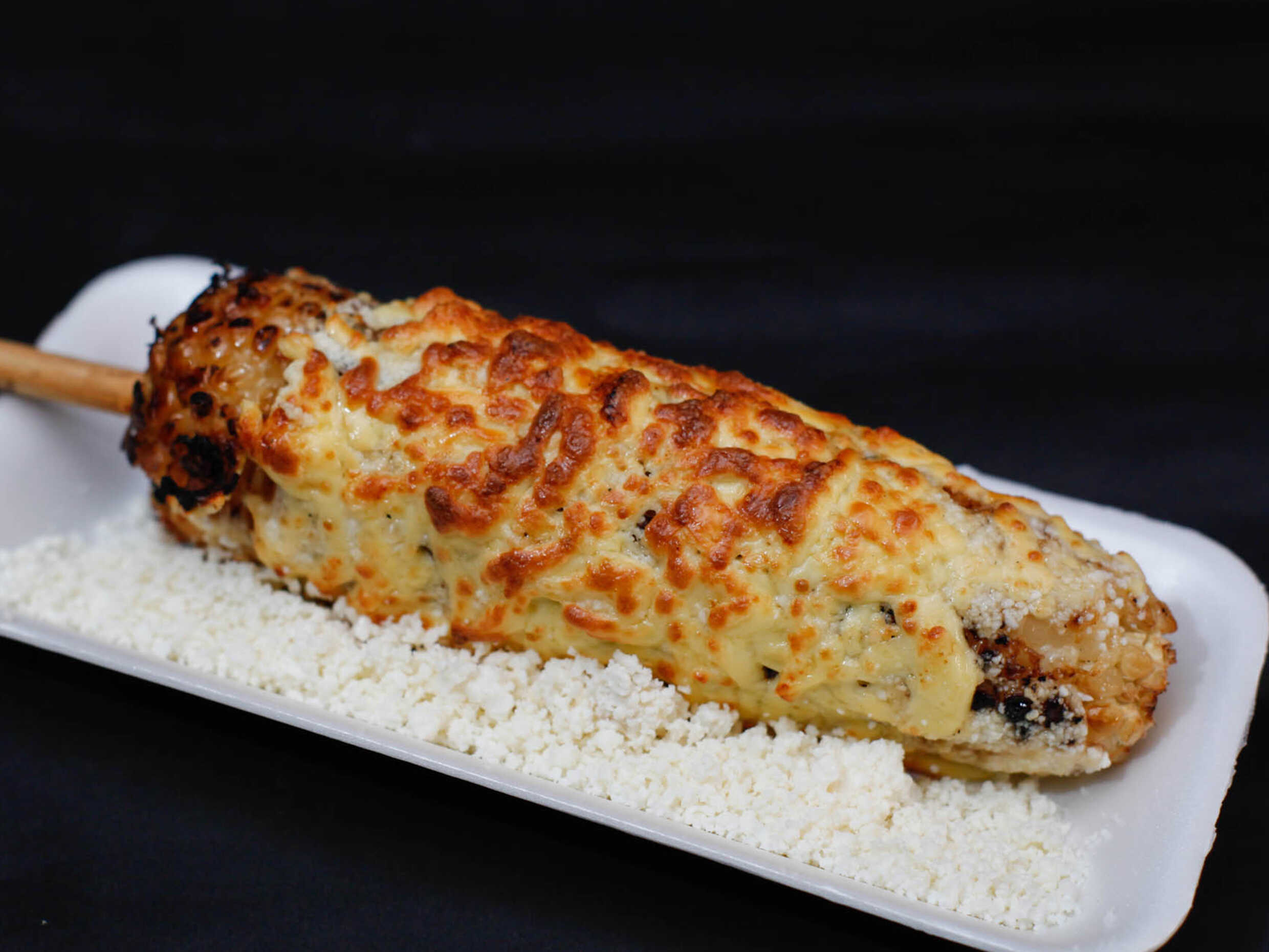 Elote entero a elegir, mayonesa y queso chasquero, puesto a las brasas hasta crear capa dorada.