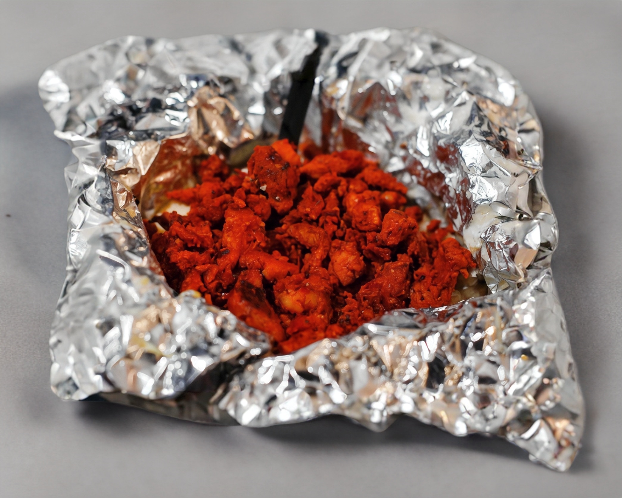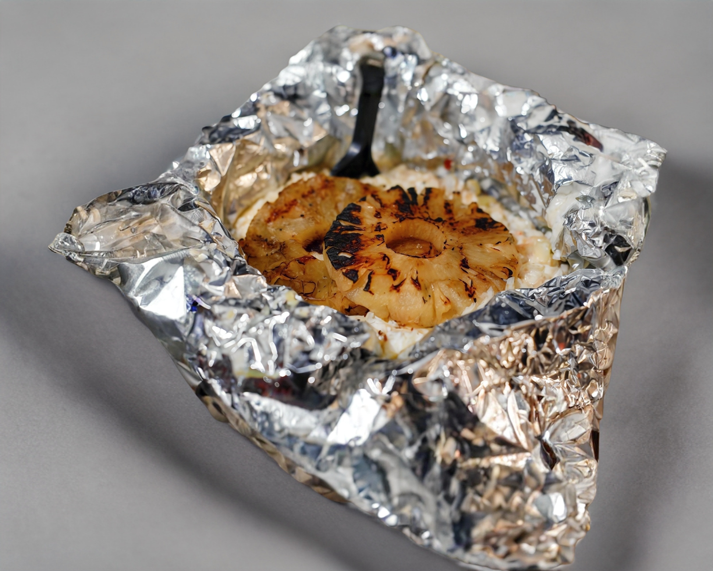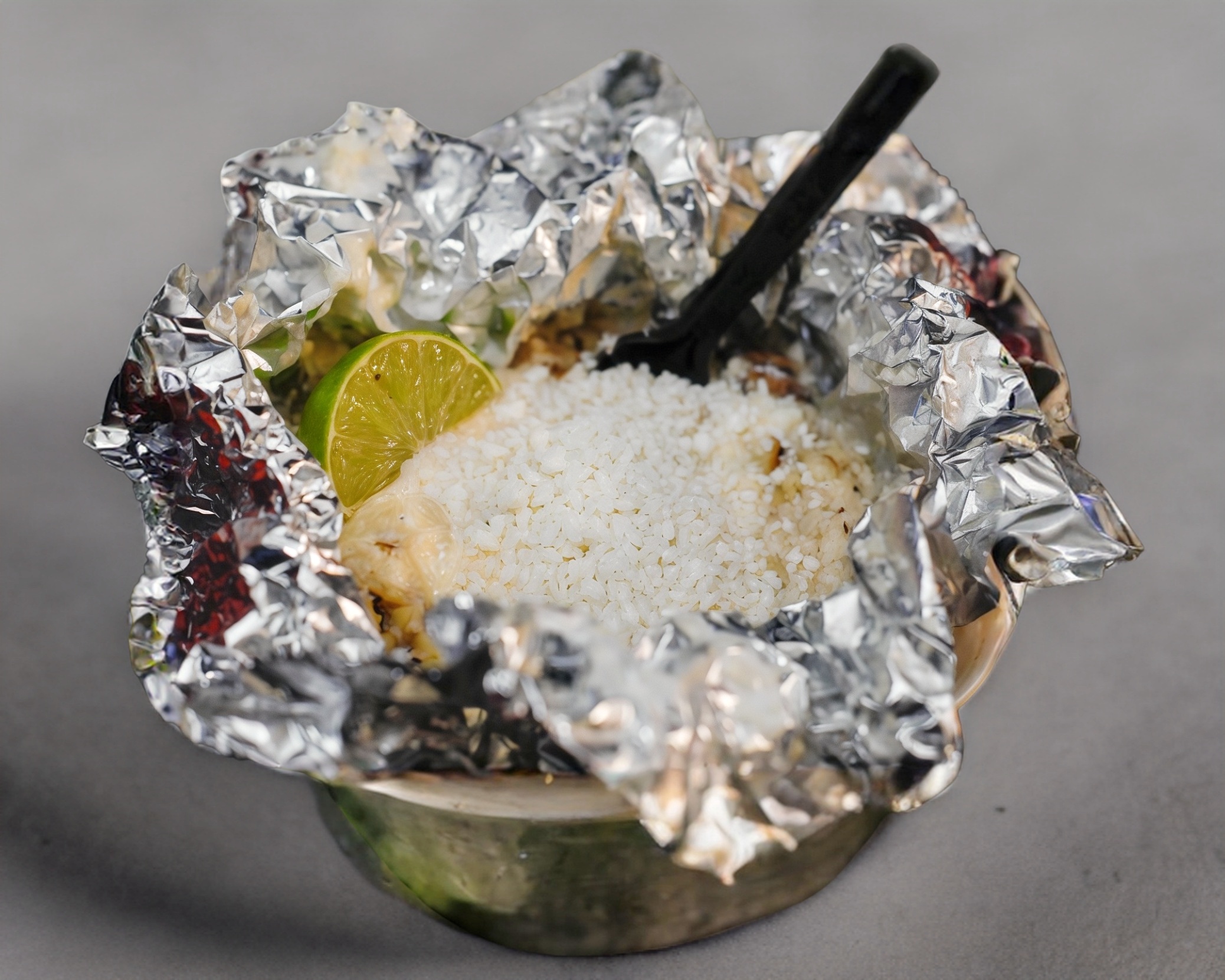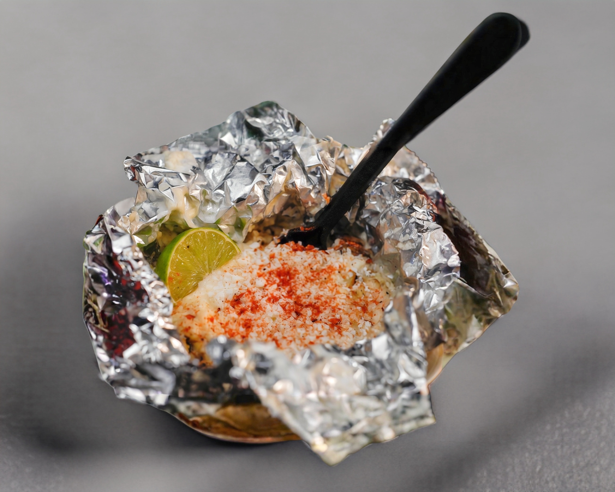 Elote desgranado, champiñón natural, mayonesa y queso chasquero, todo envuelto en papel aluminio y cocido a las brasas hasta que se gratine.