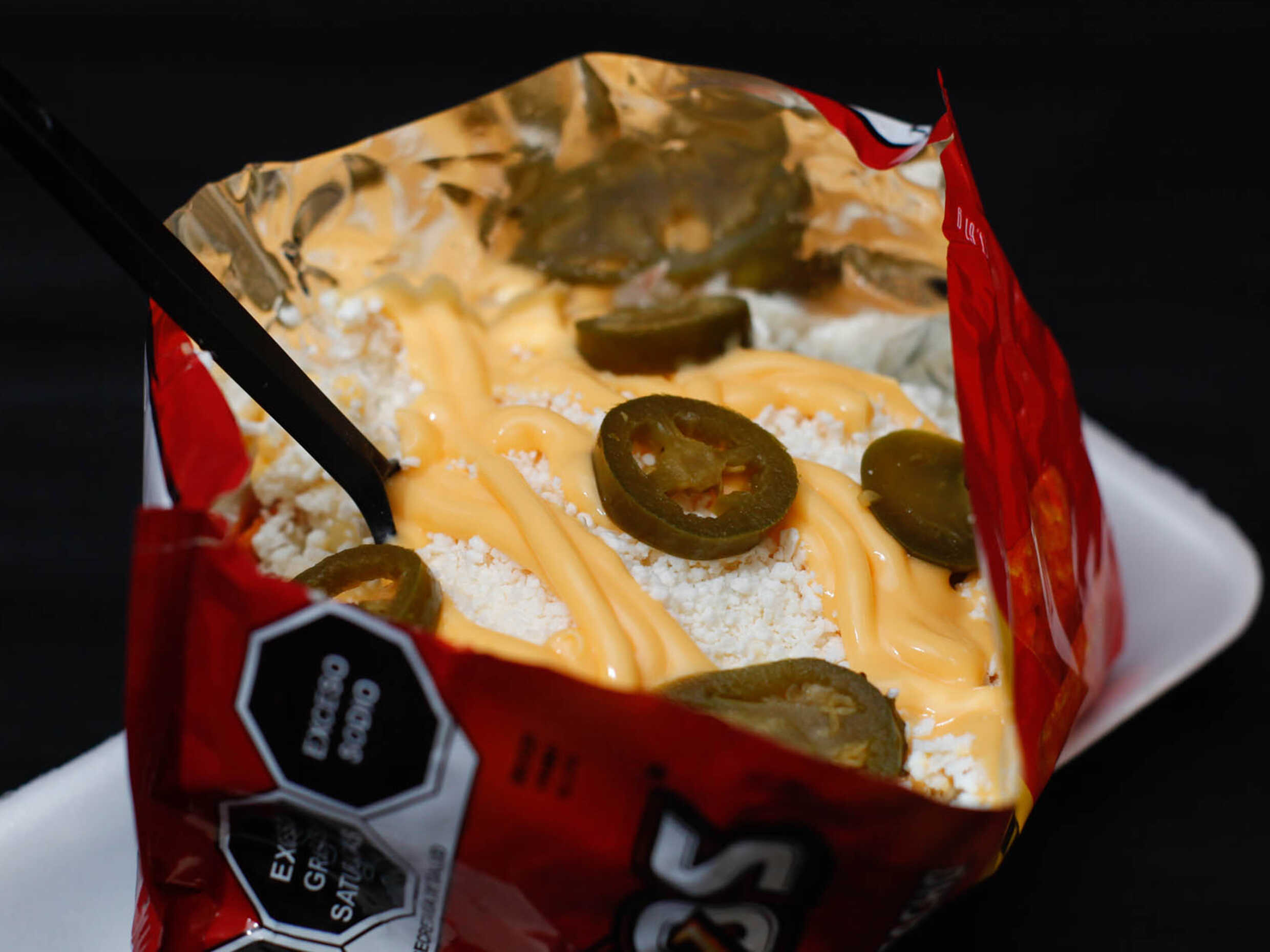 Sabrita a elegir, granos de elote, mayonesa, queso chasquero y queso de nacho