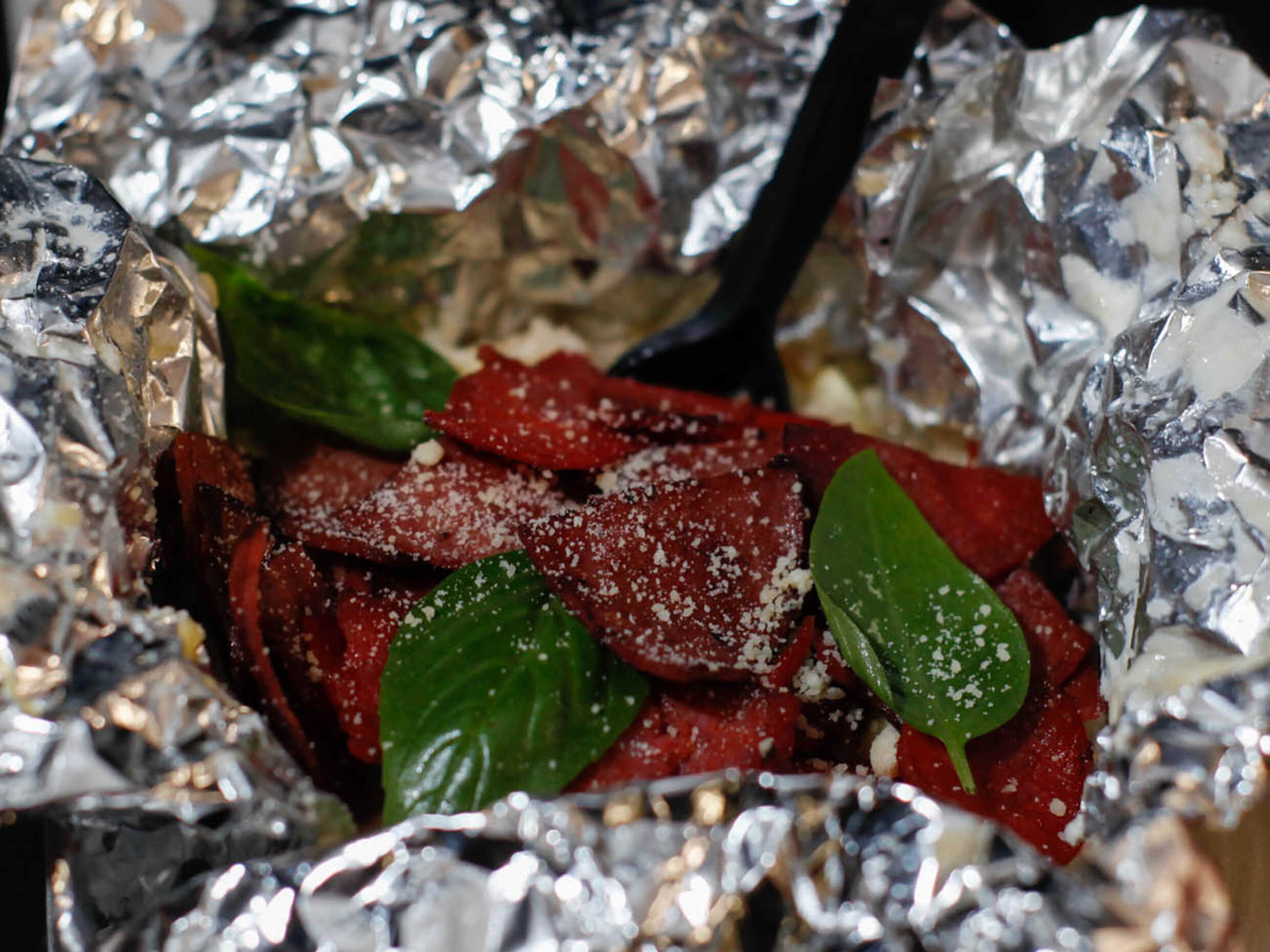 Elote desgranado, champiñón natural, mayonesa y 5 quesos manchego, gouda, americano, chasquero y parmesano, cocido a las brasas hasta que se gratine, sazonado con orégano, albahaca y se agrega salami y pepperoni.