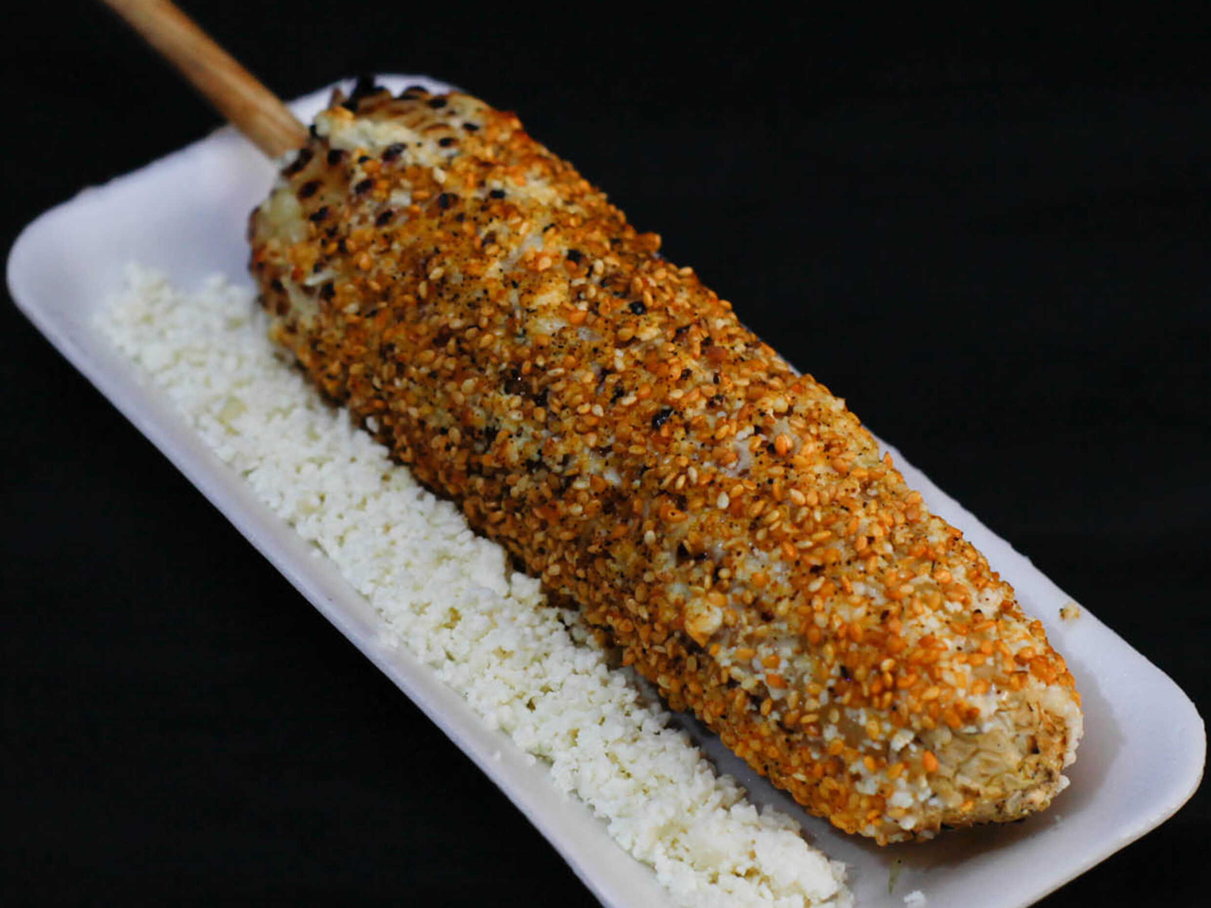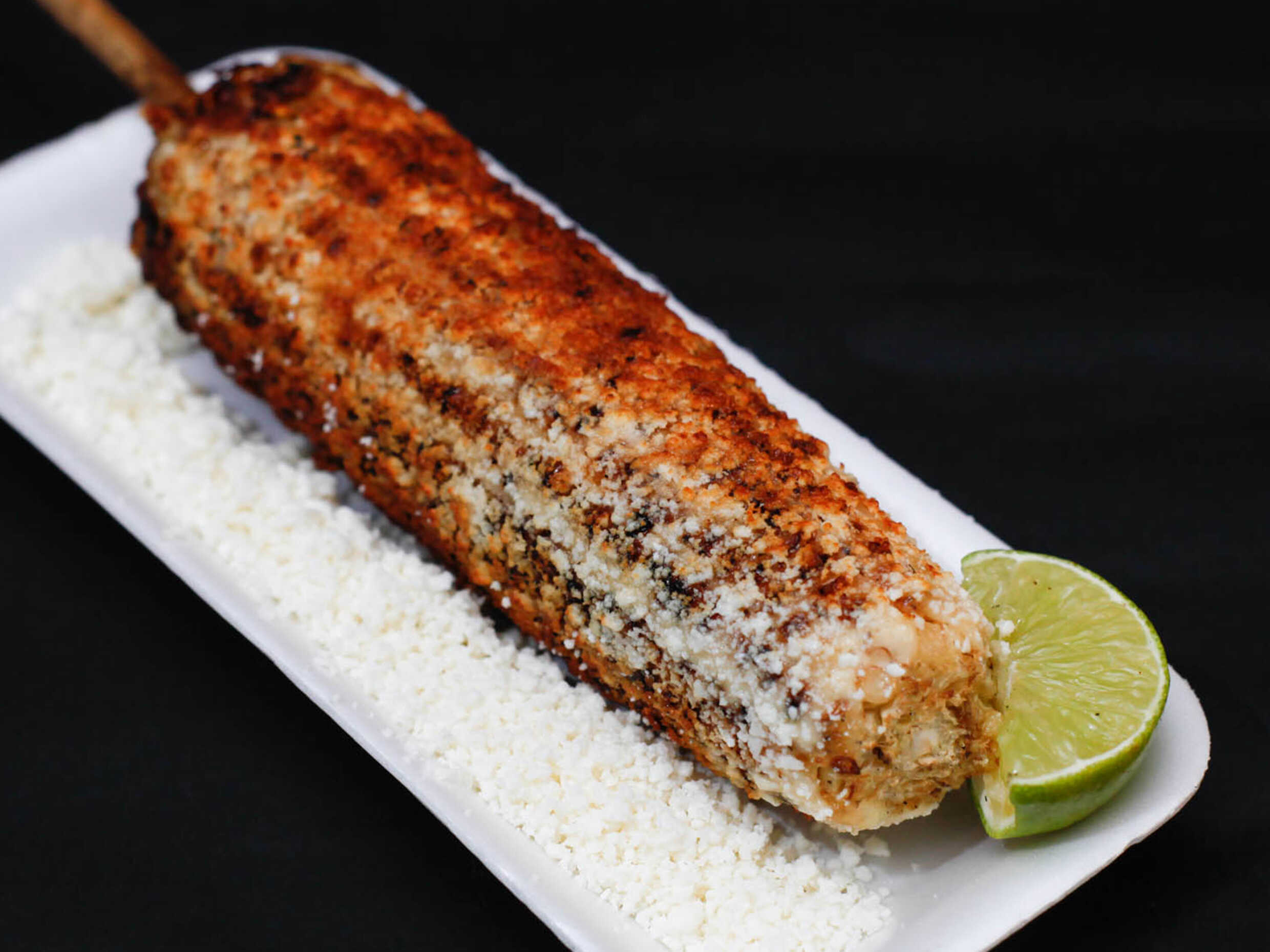 Elote entero a elegir, mayonesa, queso chasquero y una capa de ajonjolí tostado, se pone a las brasas hasta que quede crujiente.