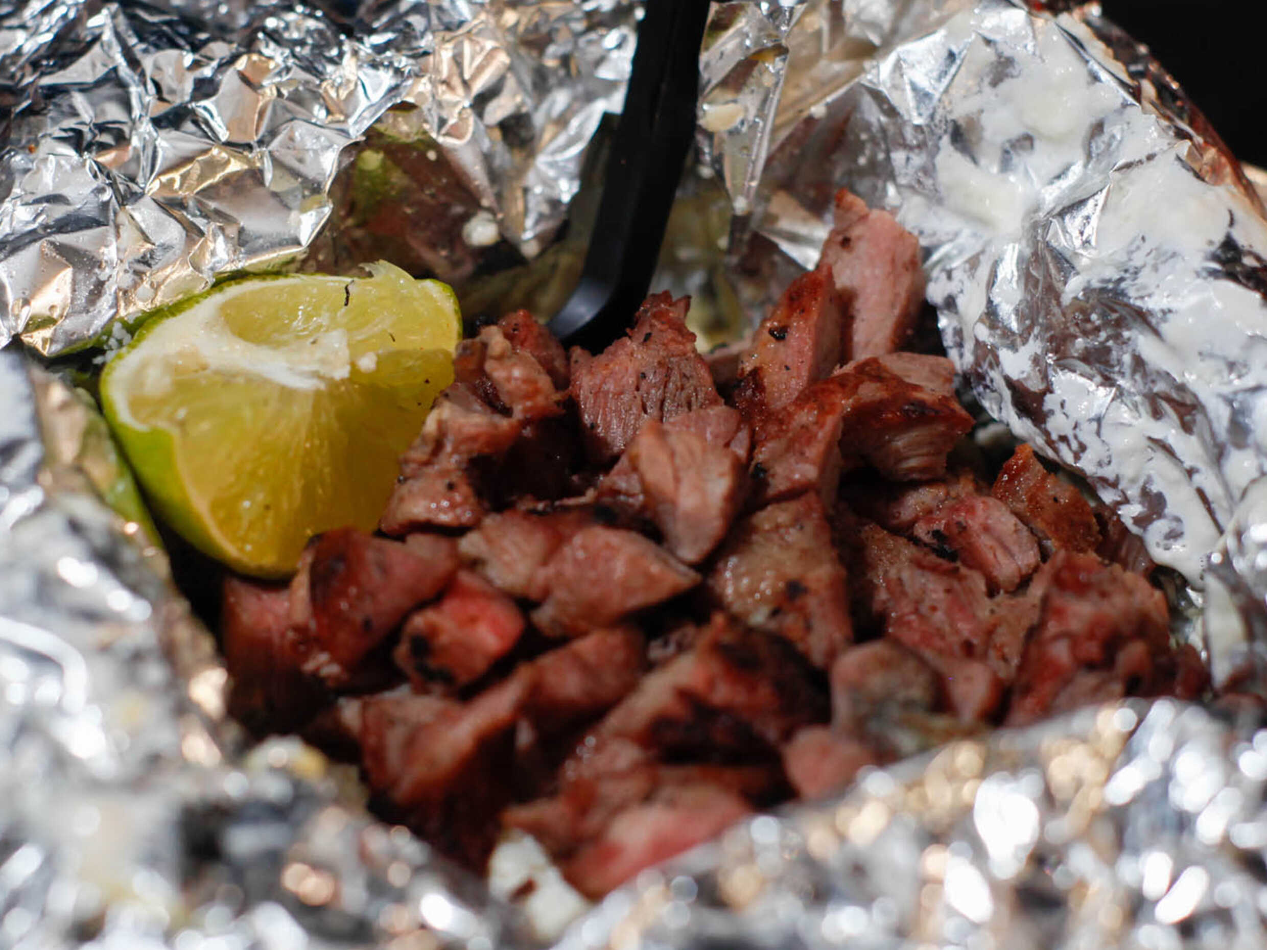 Elote desgranado, champiñón natural, mayonesa y 4 quesos manchego, gouda, americano y chasquero, cocido a las brasas hasta que se gratine y se agrega carne de arrachera.
