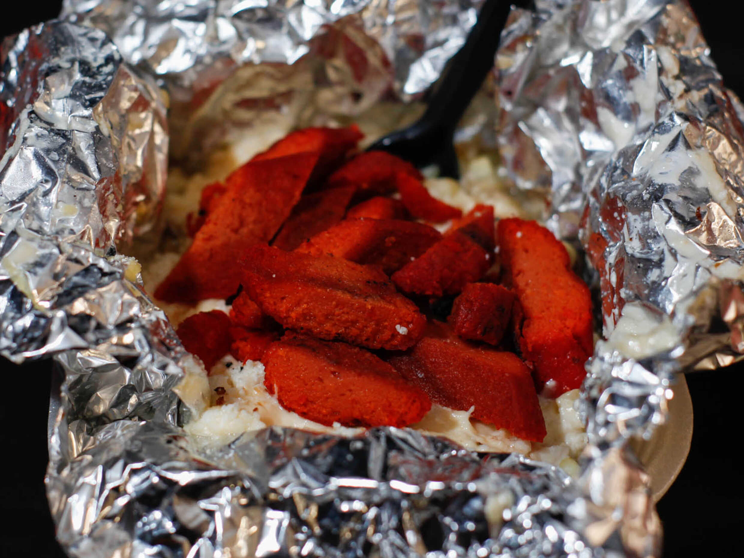 Elote desgranado, champiñón natural, mayonesa y 4 quesos manchego, gouda, americano y chasquero, cocido a las brasas hasta que se gratine y se agrega chorizo.
