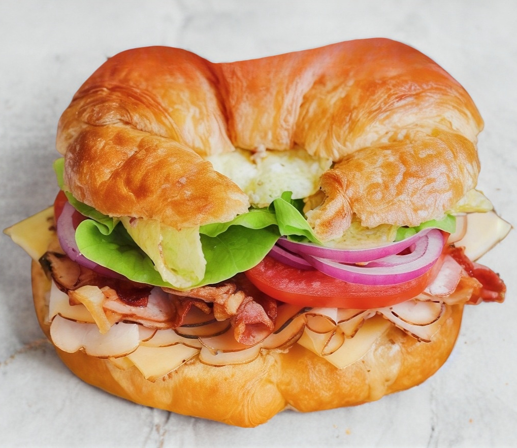 Pan de caja suave con mayonesa, relleno de pollo asado desmenuzado, lechuga fresca, rodaja de tomate, cebolla curtida, jamón de pavo, queso Deysi, salchicha y aguacate.