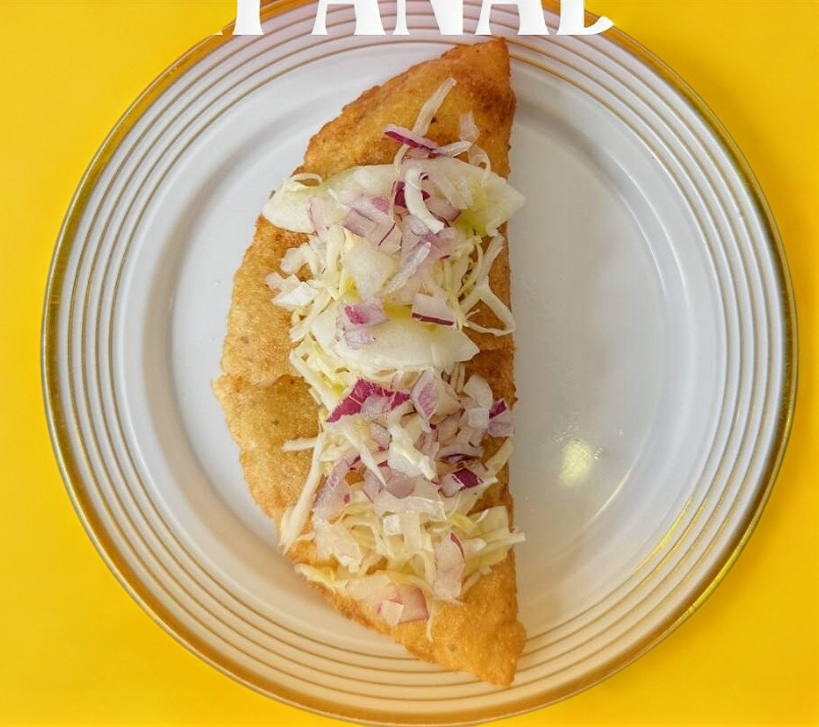 Masa de maíz en forma de media luna frita, rellena de queso de hebra. Se sirve acompañada de cebolla morada curtida, salsa de tomate y repollo.