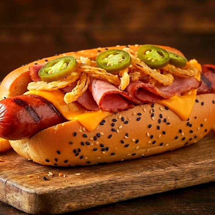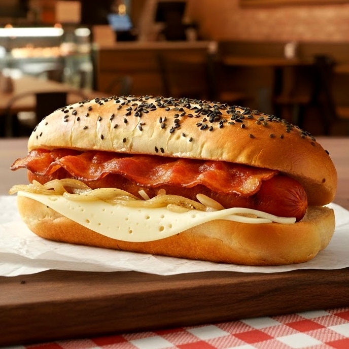 Pan artesanal clàsico con salchicha de pavo, cebolla frita, tocino, queso y aderezo de mayonesa.