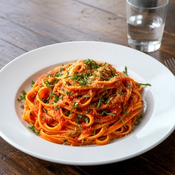 Pasta bañada en una salsa de tomate y especias, acompañada con trocitos de pan tostado y decorada con queso parmesano y perejil.
