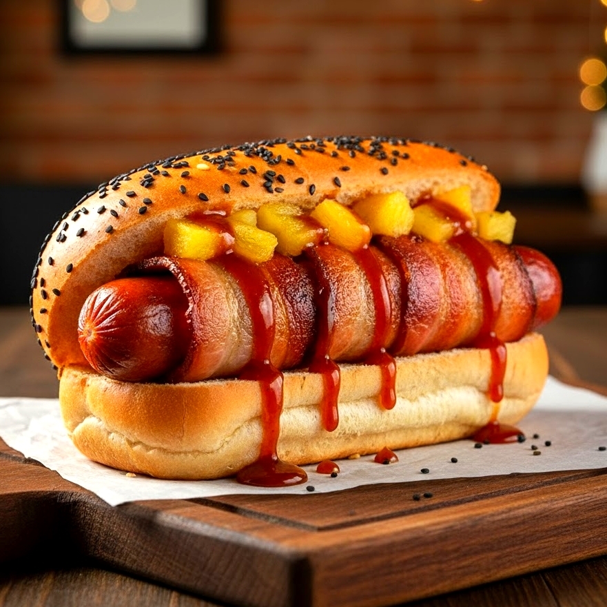Pan artesanal clásico con salchicha de pavo, cebolla frita, queso, tocino y trocitos de piña bañada en un aderezo de tamarindo chipotle y su aderezo de mayonesa.