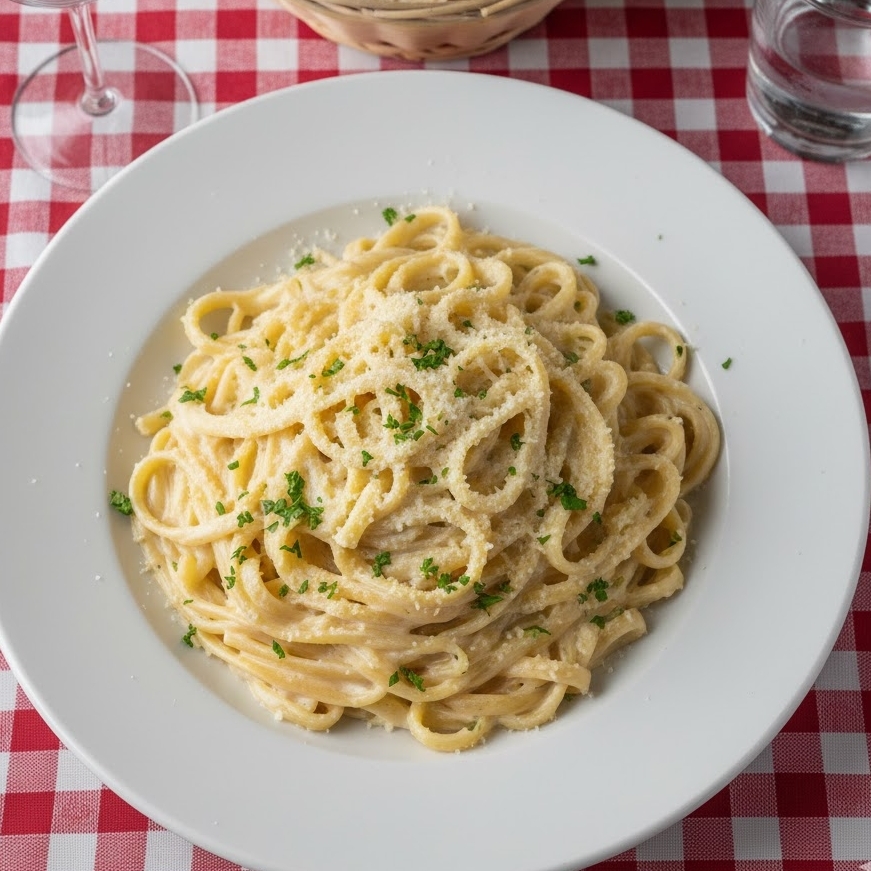 Pasta bañada en una salsa de crema queso y parmesano, con trocitos de tocino, acompañada con trocitos de pan tostado y decorada con queso parmesano y perejil.