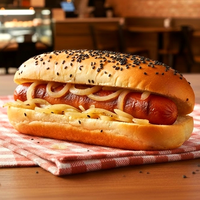 Pan artesanal clásico con salchicha de pavo, cebolla frita y aderezos.