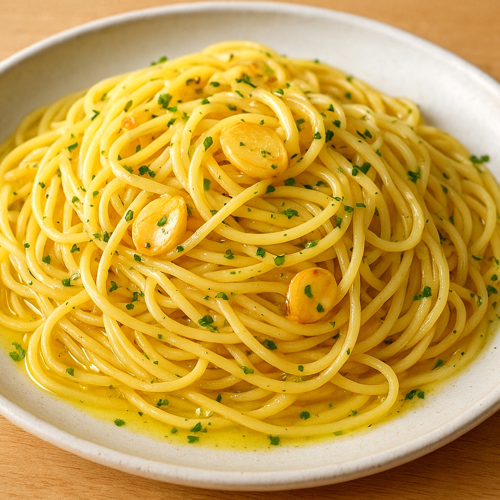 Pasta salteada con trocitos de tocino ajo y aceite de oliva, acompañada con trocitos de pan tostado y decorada con queso parmesano y perejil.