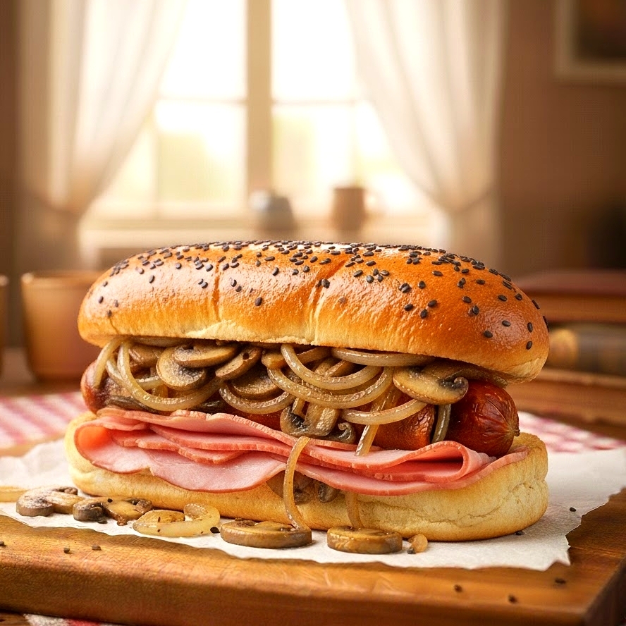 Pan artesanal clásico con salchicha de pavo, cebolla caramelizada, jamón, champiñones y su aderezo de mayonesa chipotle.