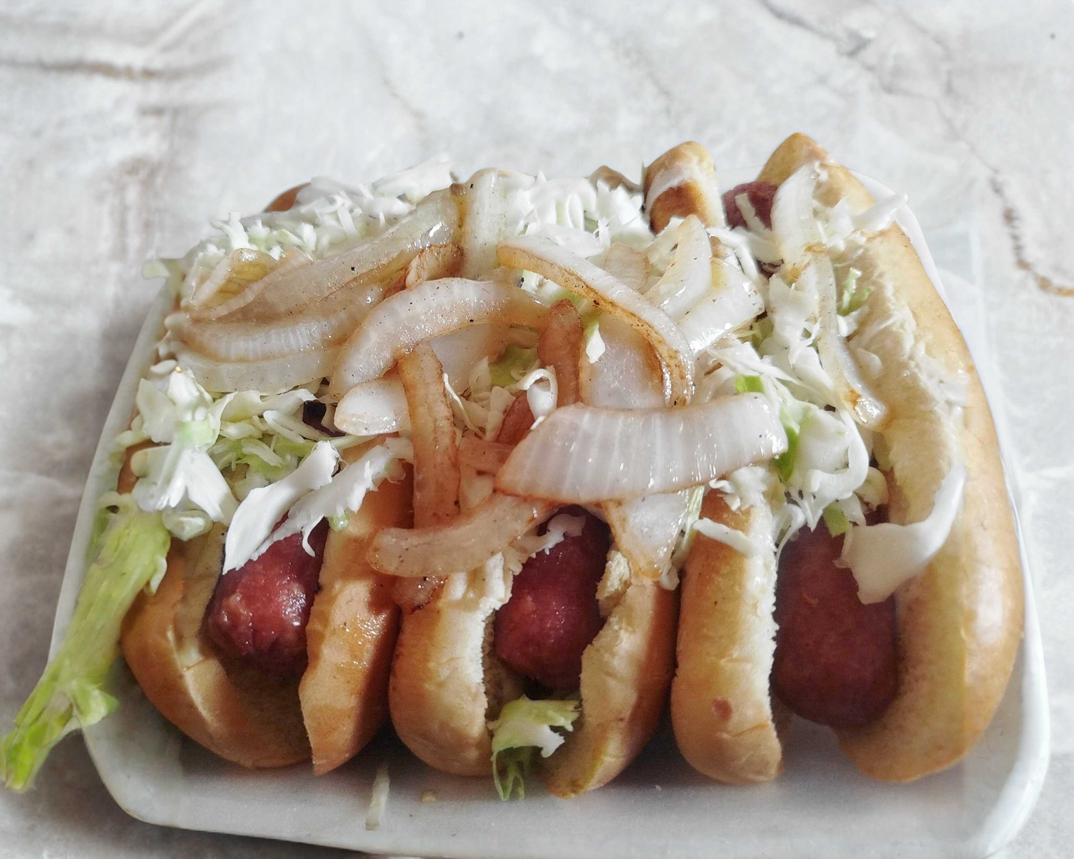 Con queso de hebra,carne molida,jamon, salchicha,repollo.mayonesa,lechuga