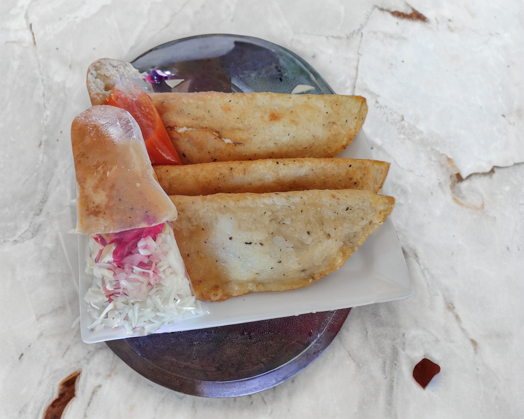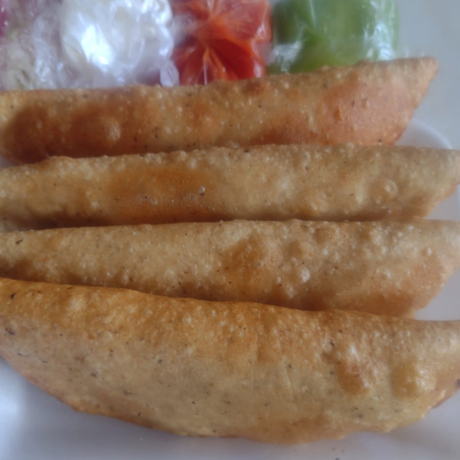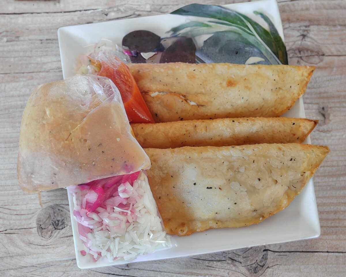 Empanada de carnita con tomate, cebolla roja, lechuga, repollo