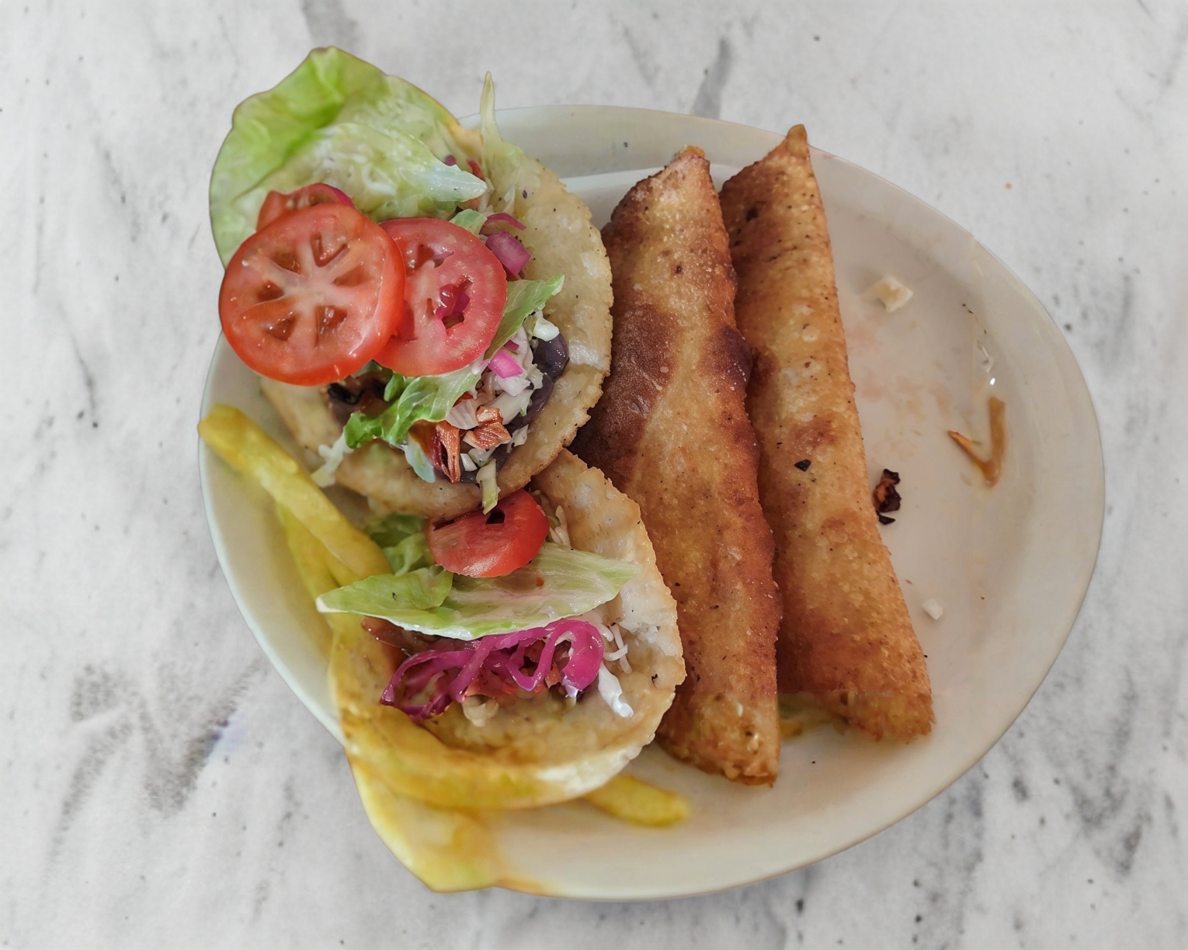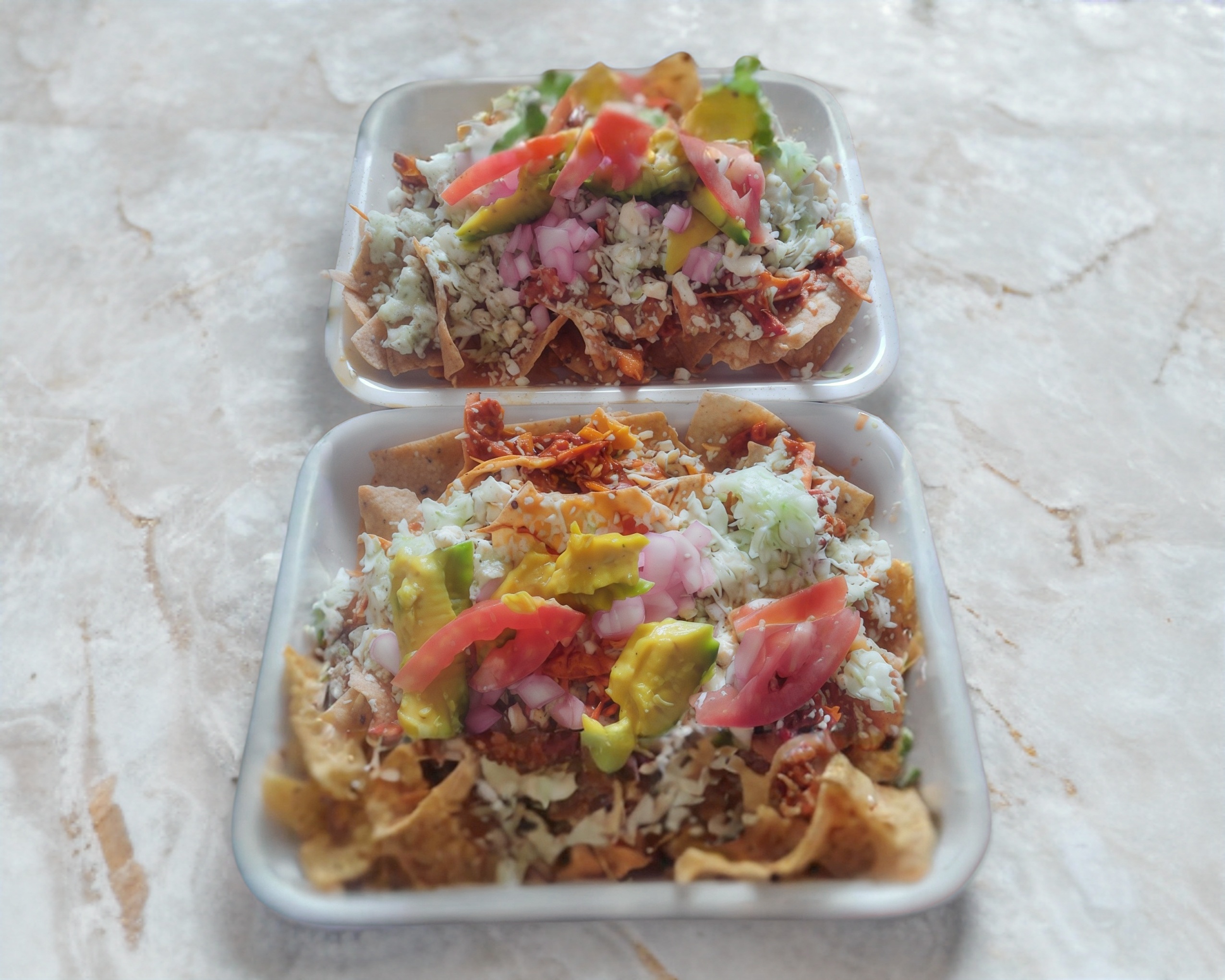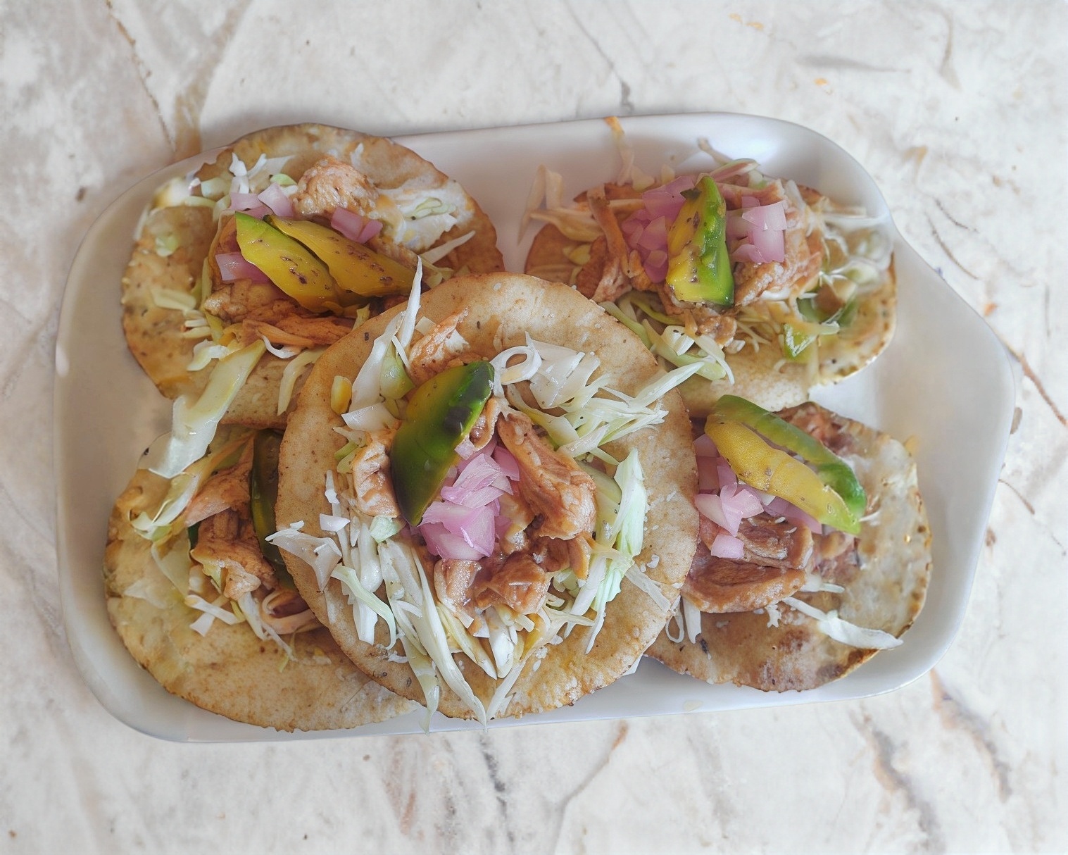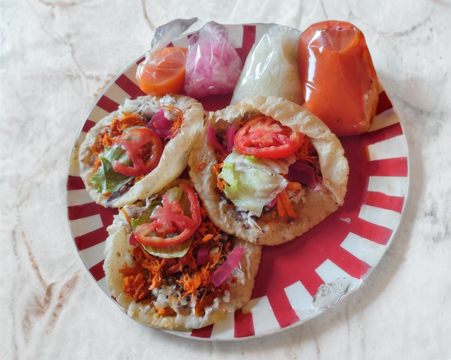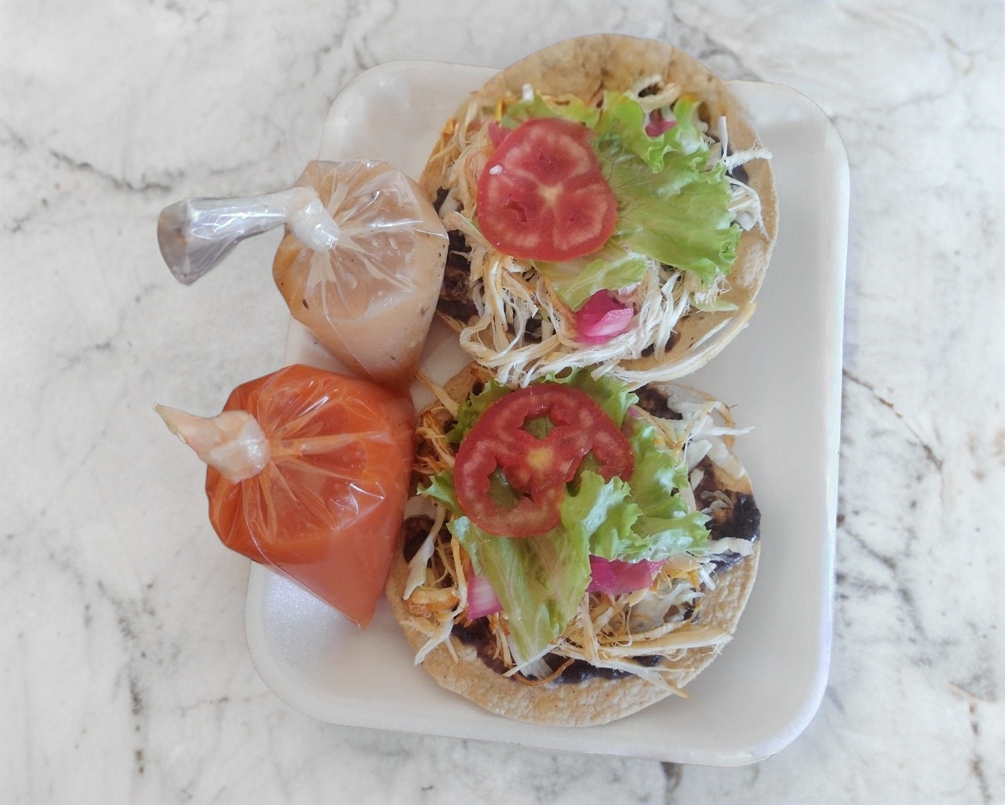 Panucho de pollo con tomate, cebolla roja, lechuga, repollo, frijol refrito