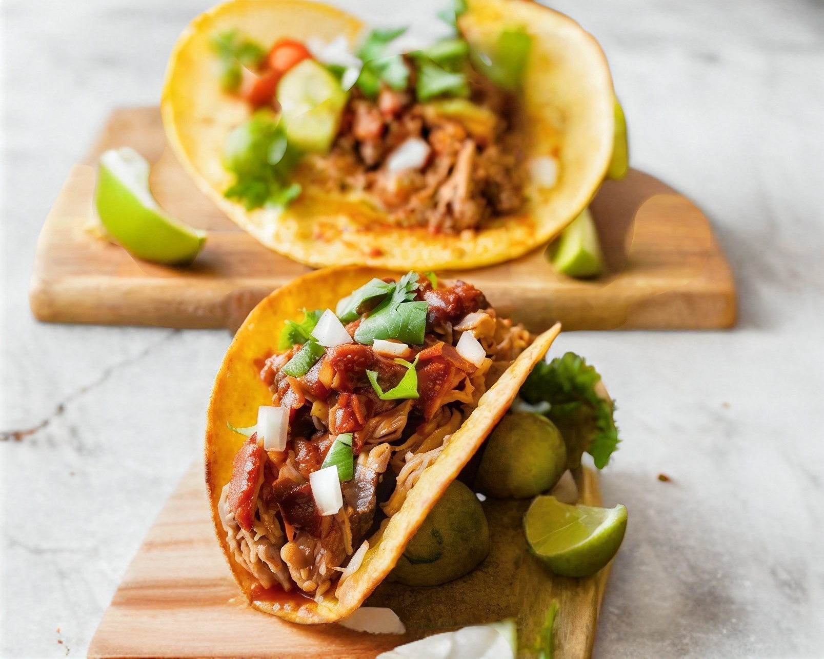 Tortilla de maiz con carne molida, frijol, queso de hebra, repollo, cebolla, lechuga, tomate