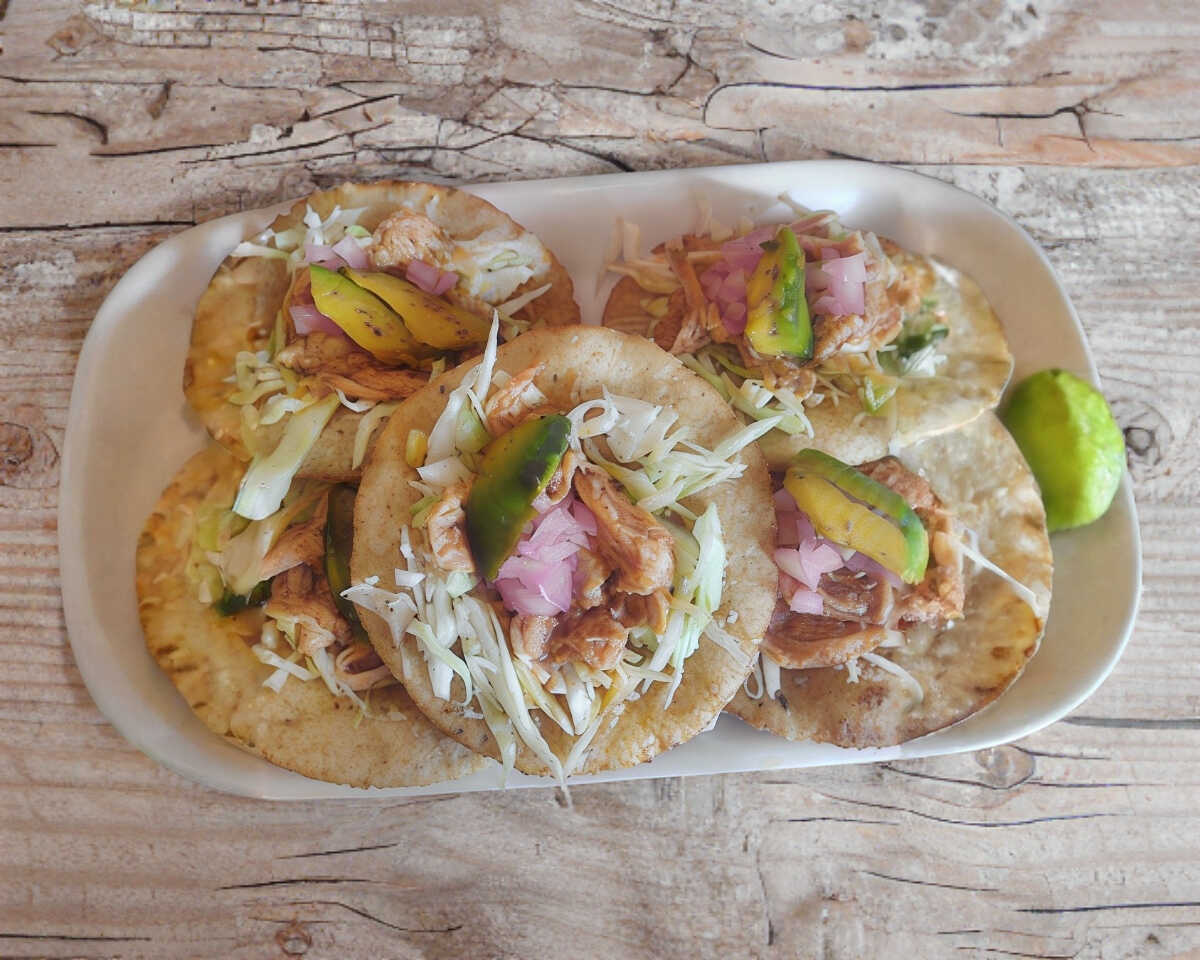Tortilla de Maiz de pollo, con queso de hebra, frijol, repollo, tomate, lechuga,cebolla curtida