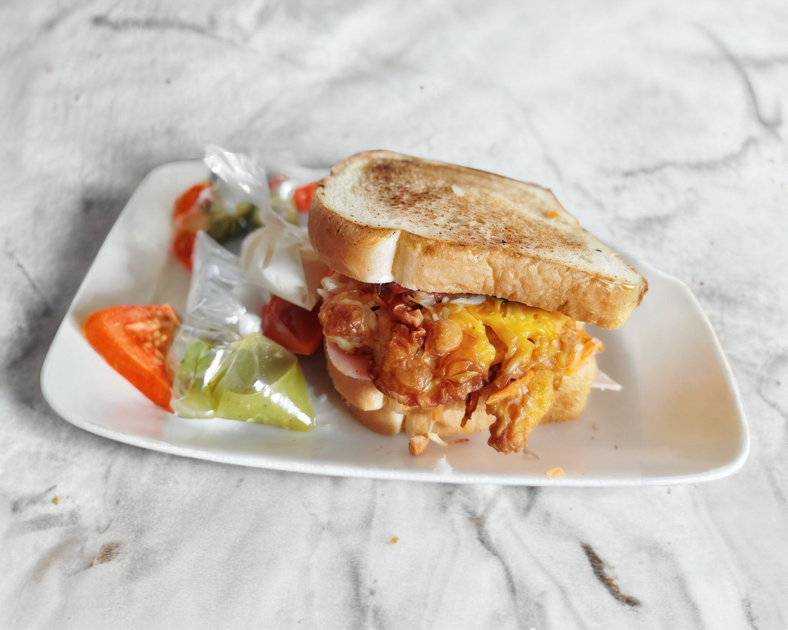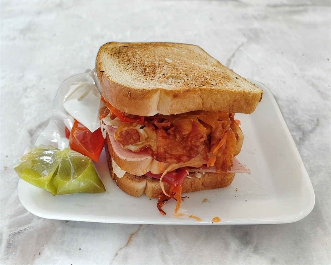 Sandwich de dos pisos con zanahoria rayada,salchicha ,pollo,Jamón,queso manchego,Mayonesa,repollo,Huevo estrellado y Salchicha