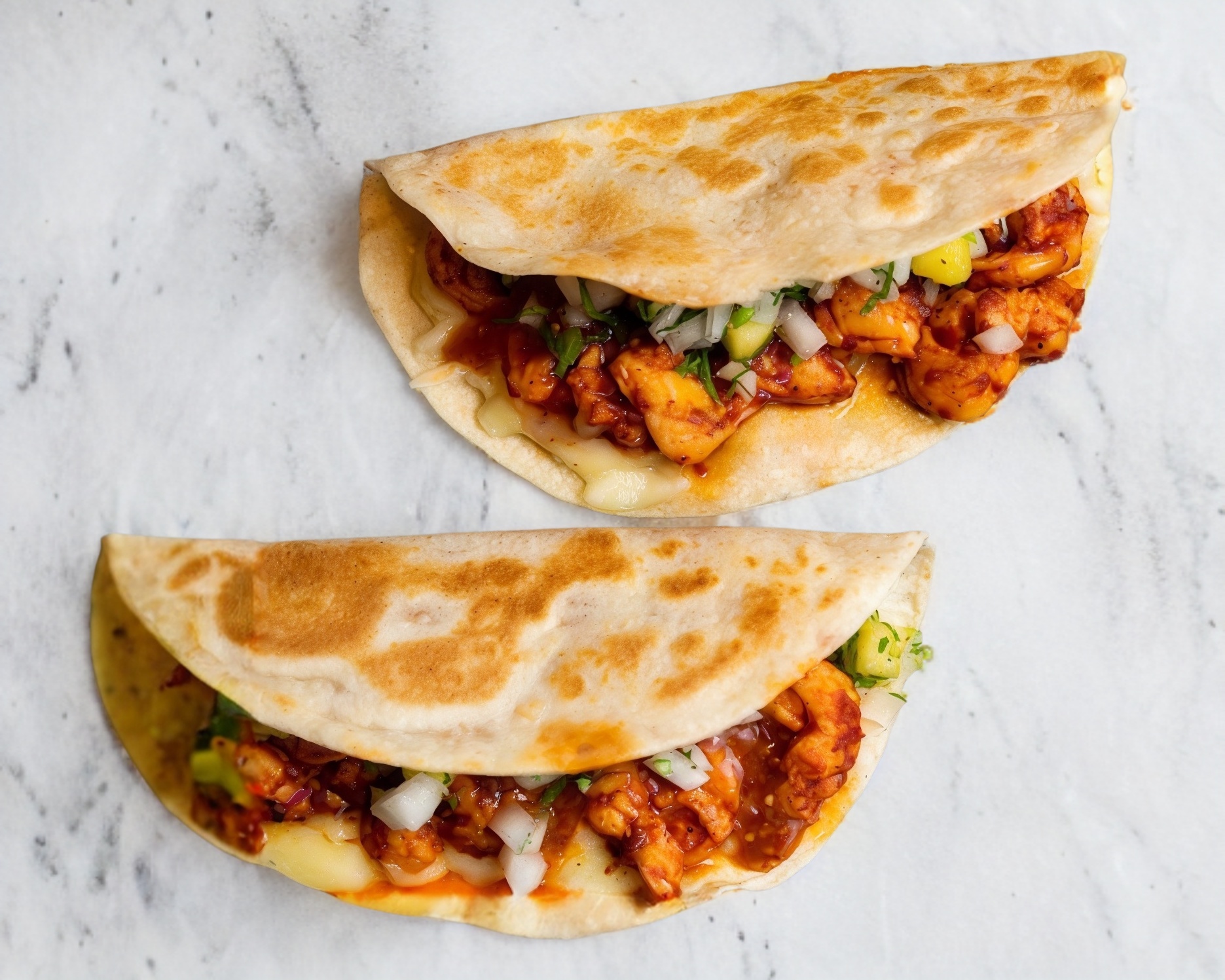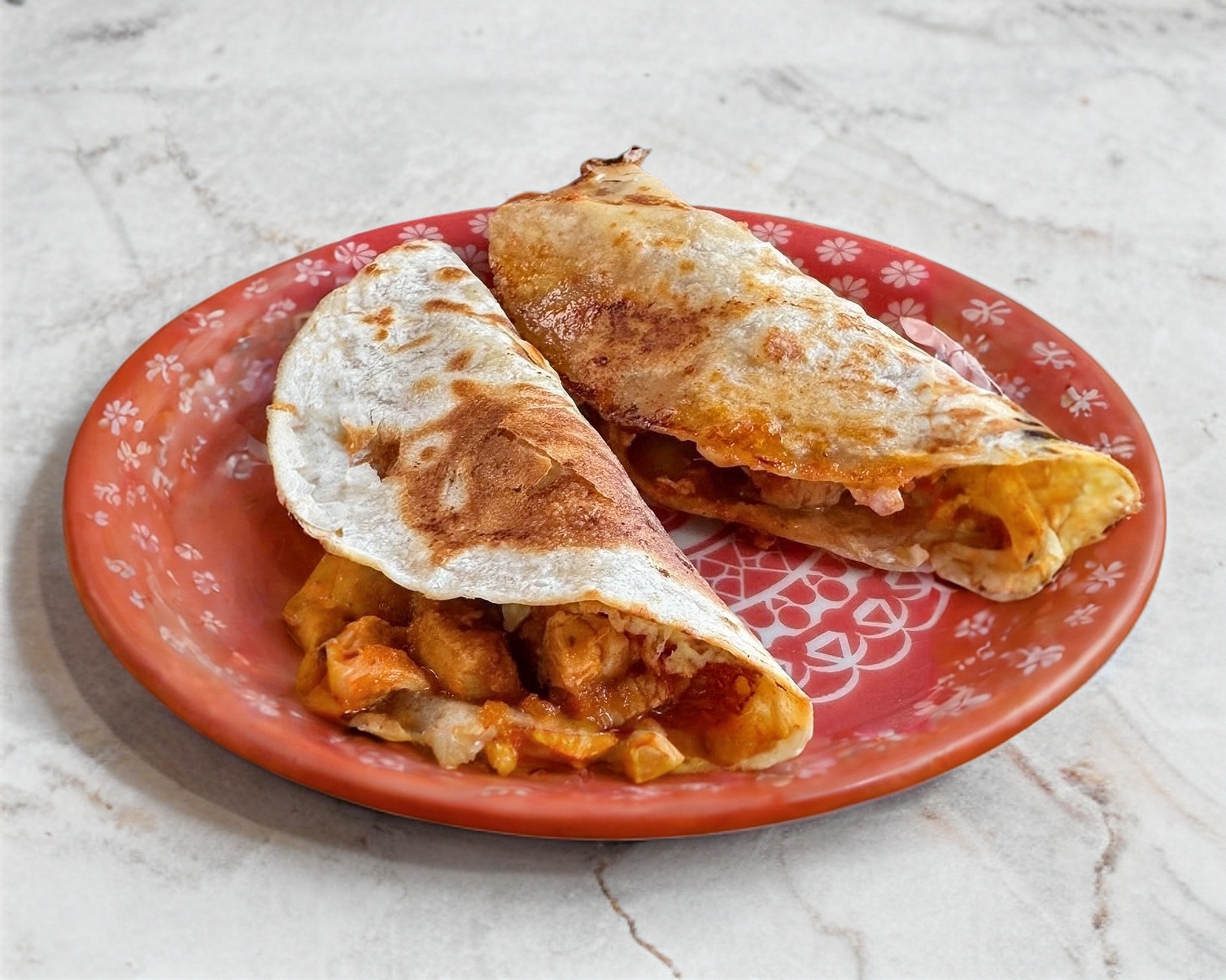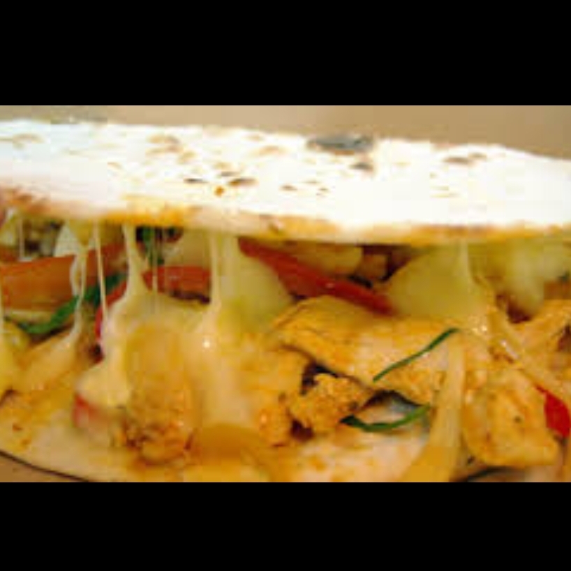 Gringa de harina de queso de hebra, pollo, tomate, repollo y lechuga