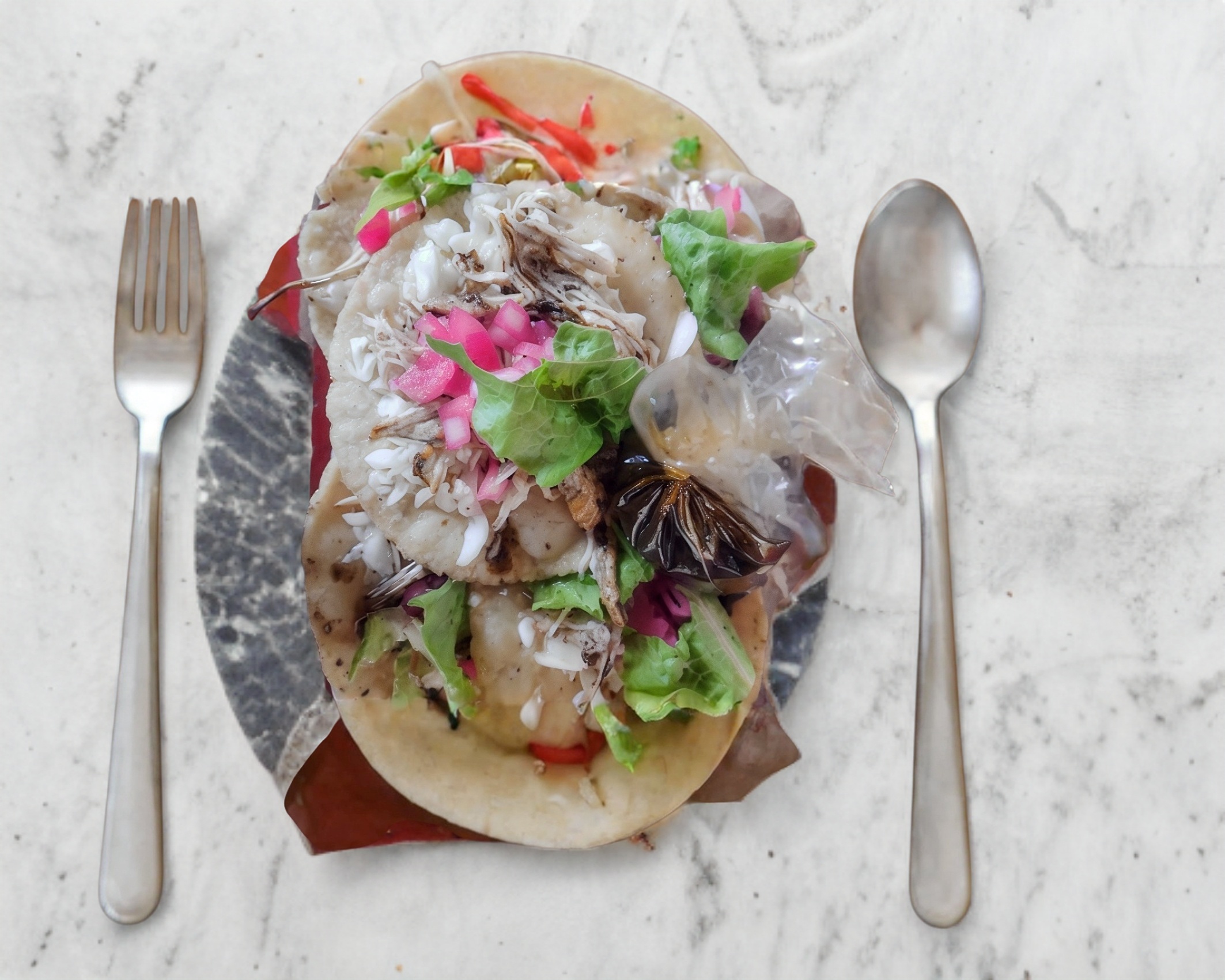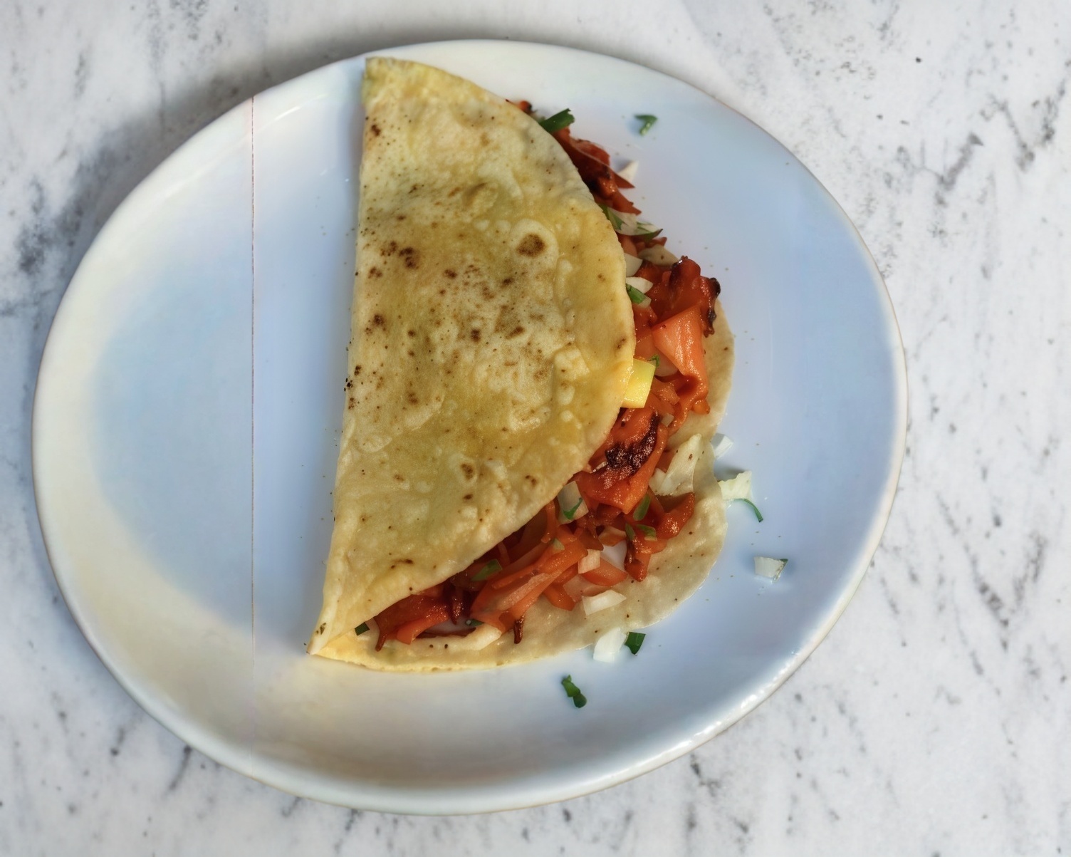 Tortilla de maiz con frijol, repollo, carnita, queso de hebra, tomate, cebolla curtida, lechuga