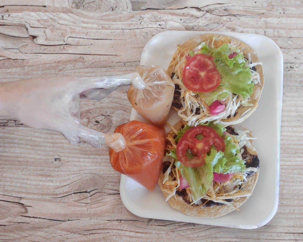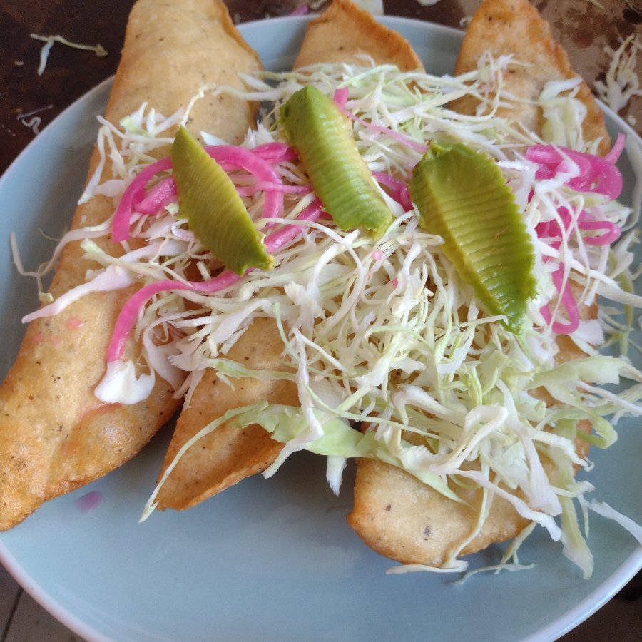 Panucho de Molida con tomate, cebolla roja, lechuga, repollo, frijol refrito
