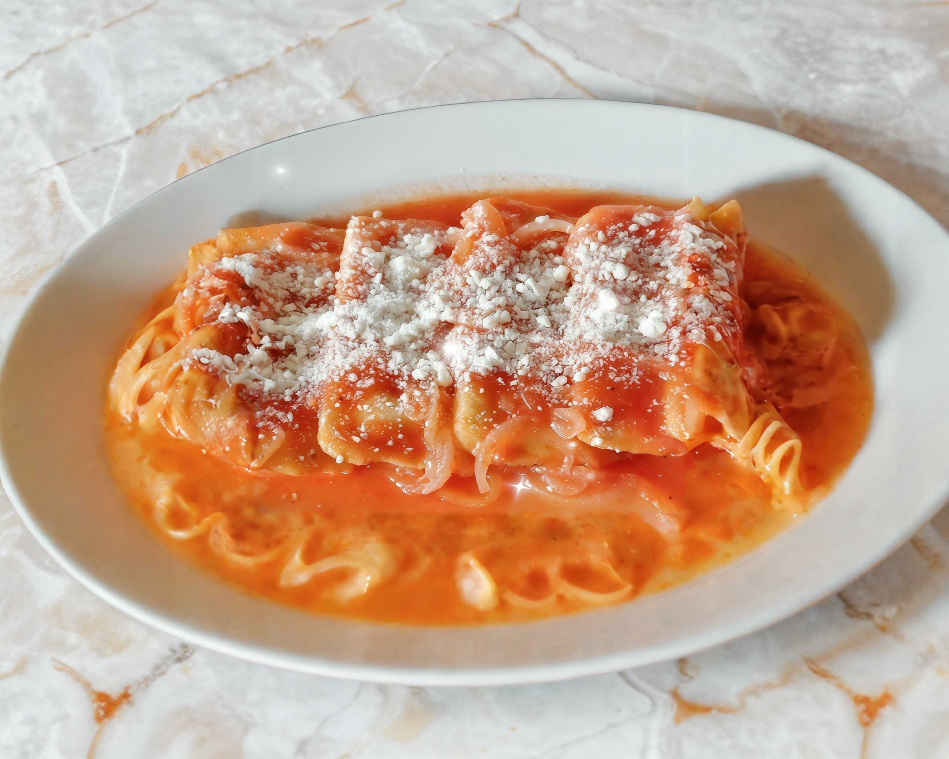con pollo,queso crema,salsa roja tomate,huevo frito como complemento,queso de hebra,cebolla curtida