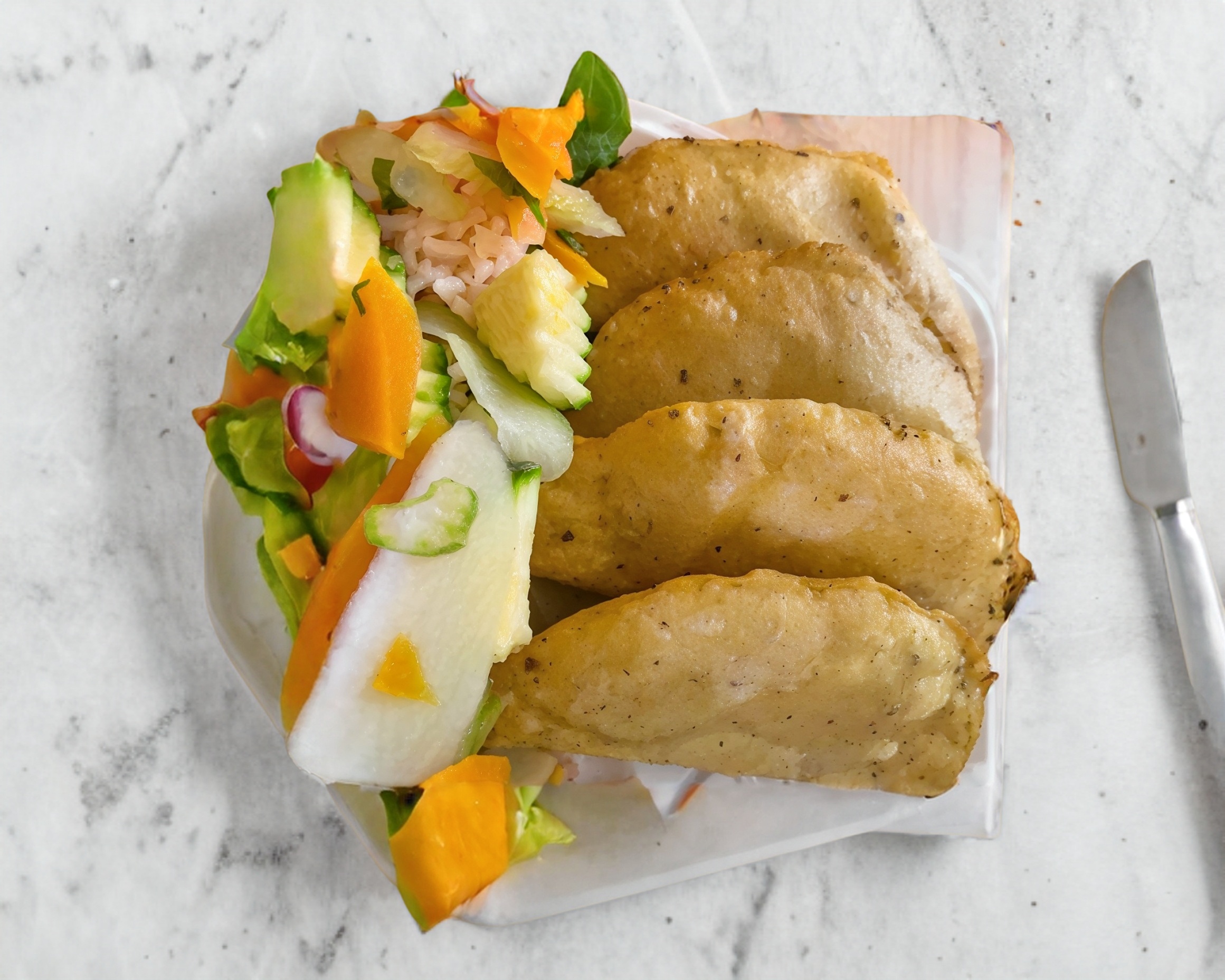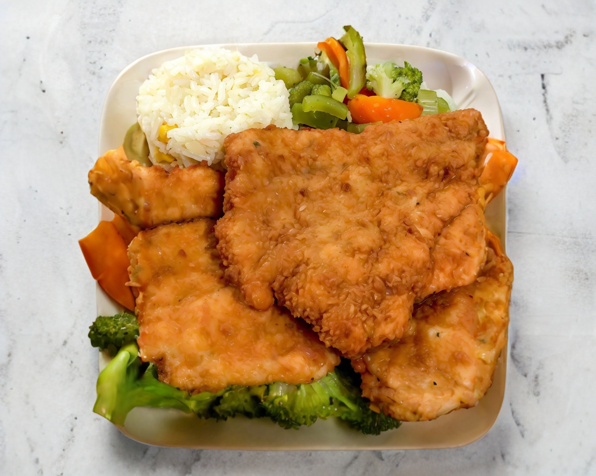Filete de cerdo empanizado, acompañado de papas a la francesa arroz y verduras