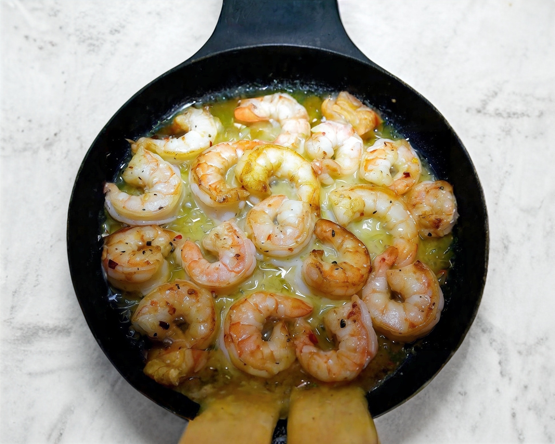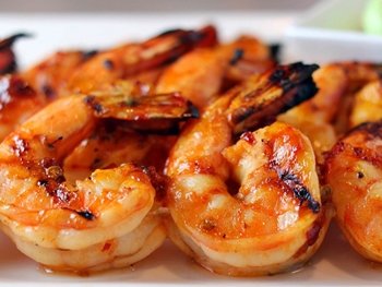 Camarones acompañados de piña, pimientos y tocino deshidratado, todo cocido al vapor.