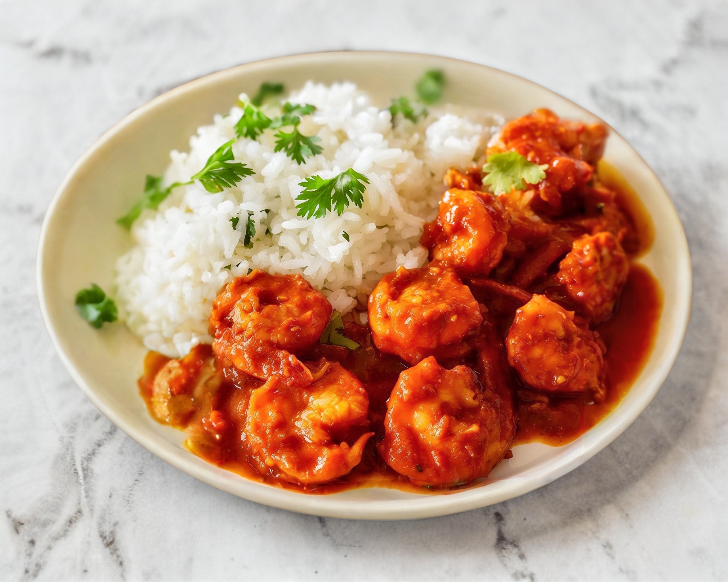 Chuleta de cerdo salteada a la plancha y cocida en su jugo con tomate, cebolla, cilantro y chile serrano, acompañado con arroz y verduras