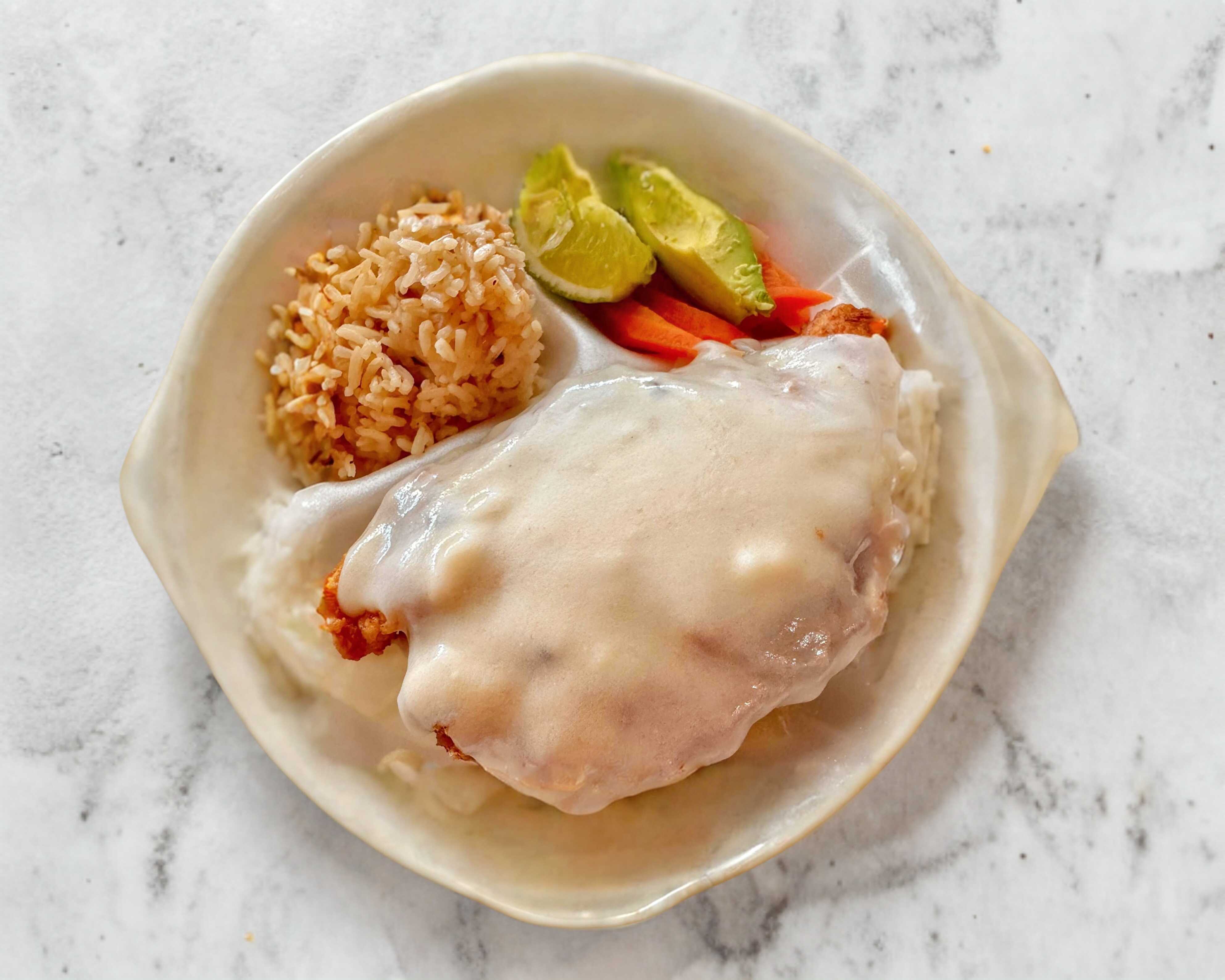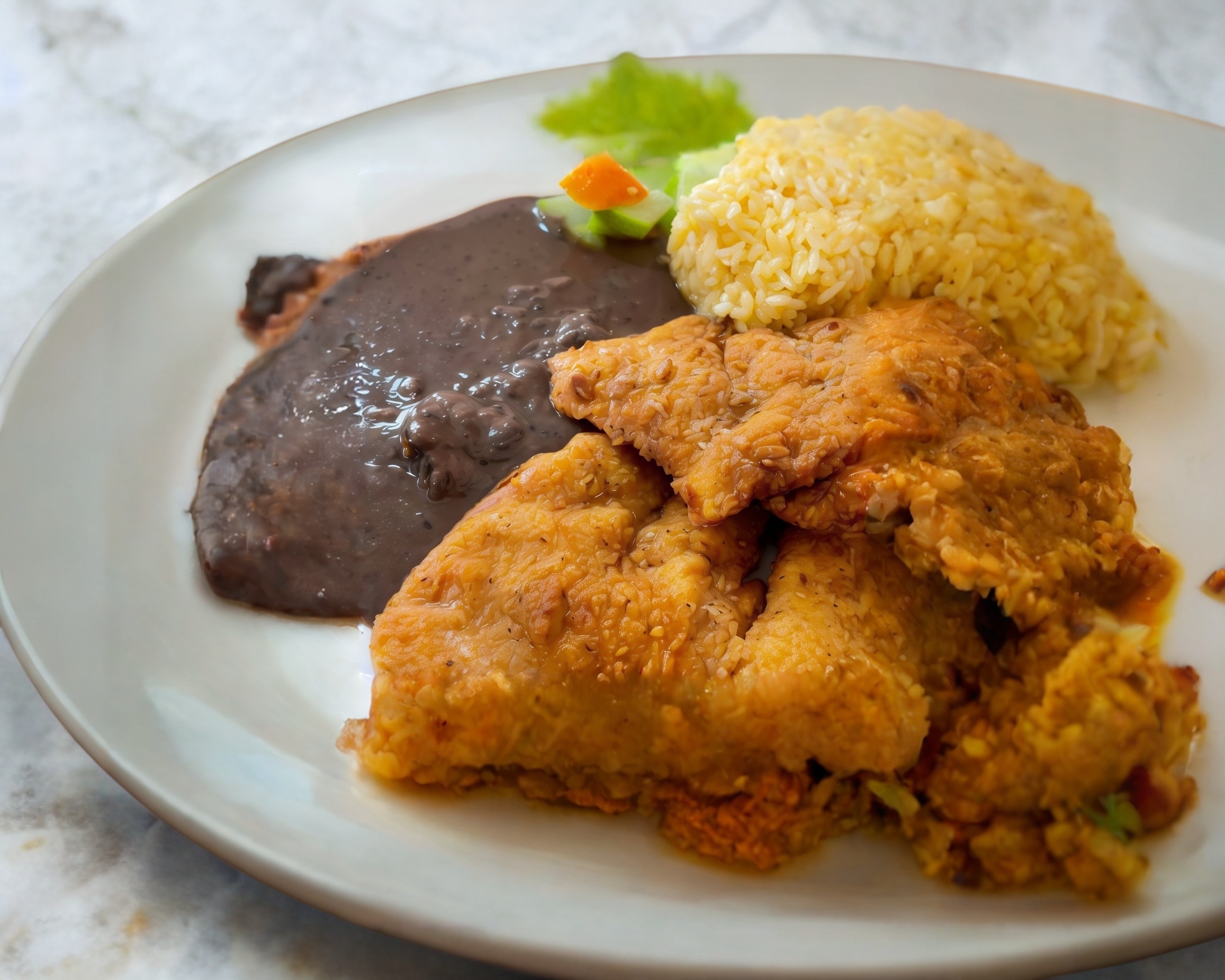 Pechuga de pollo empanizada y acompañada de frijoles refritos, arroz y verdura