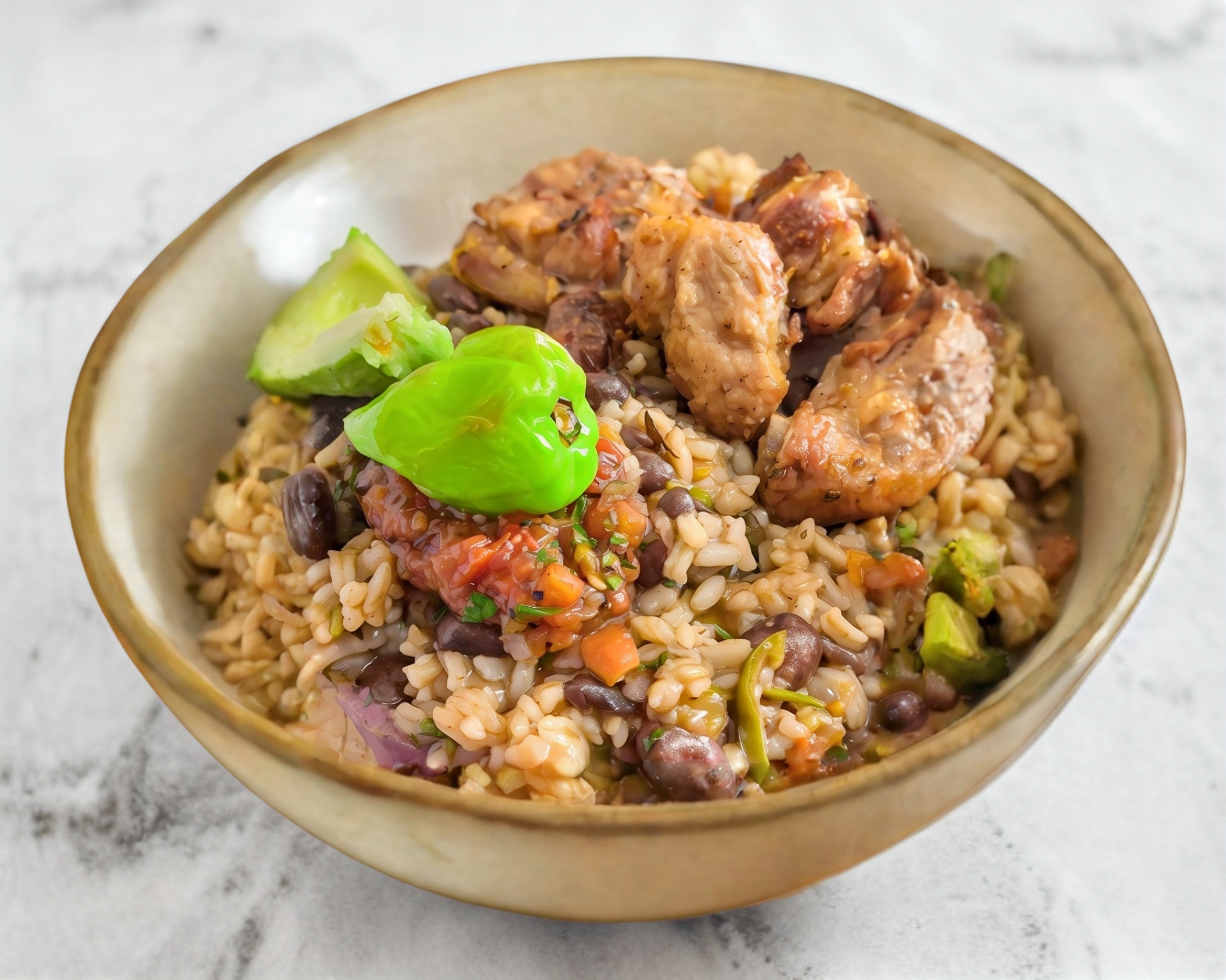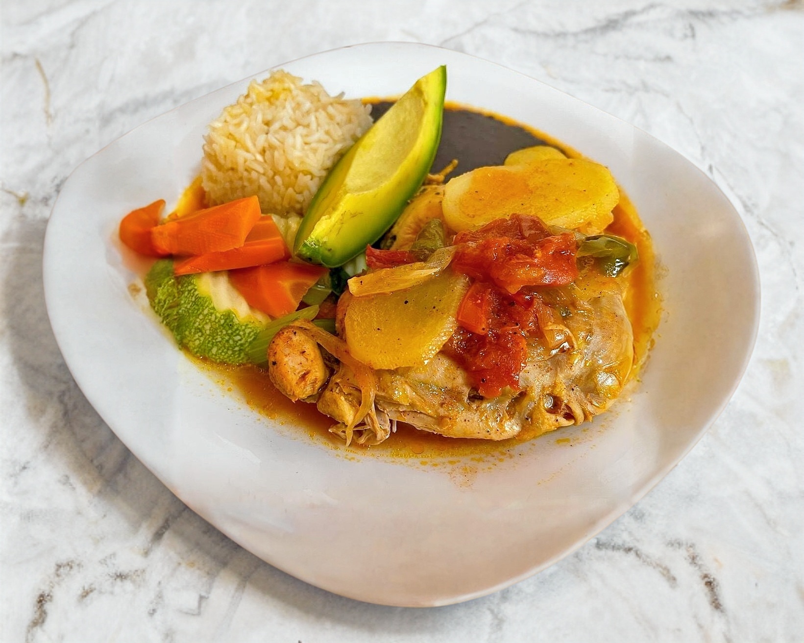 Pollo aderezado con adobo y guisado con tomate y papas, acompañado de arroz y frijol