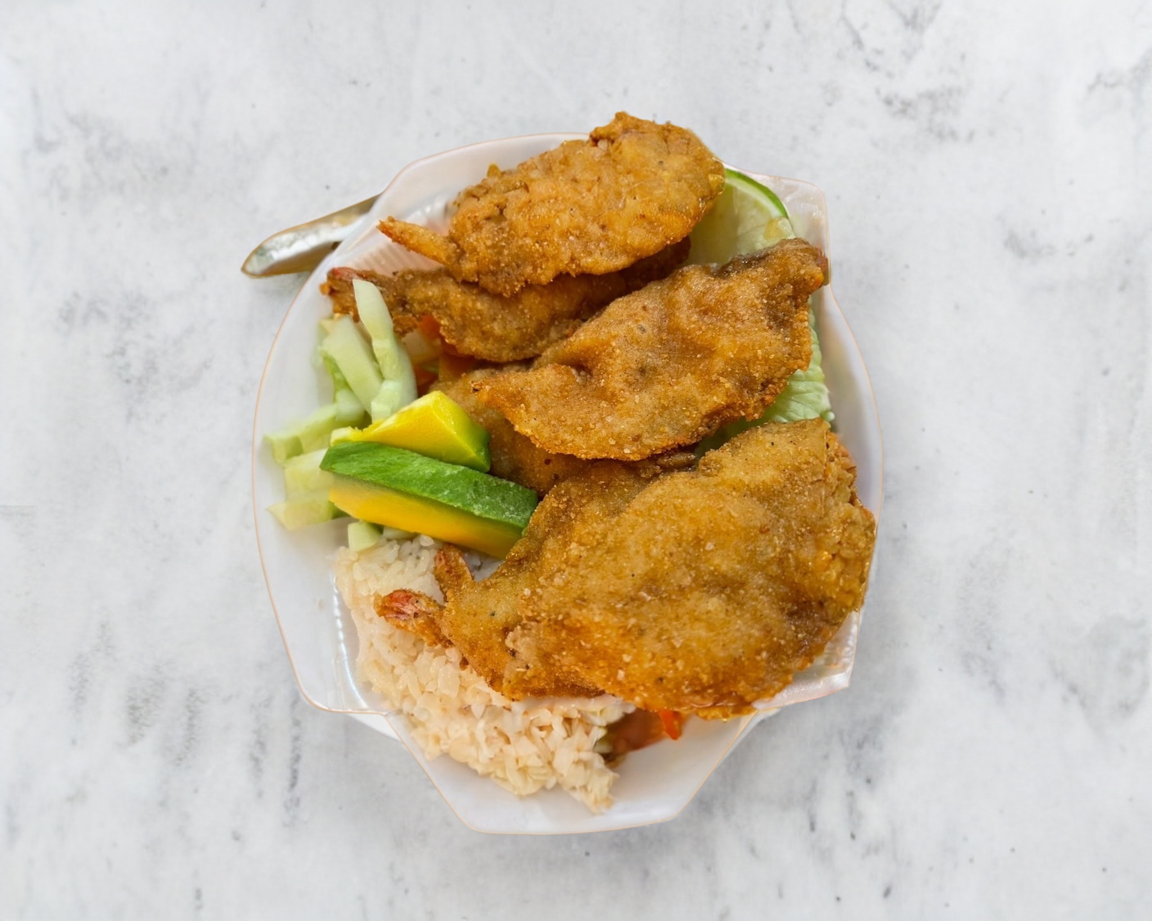 Tradicionales camarones empanizados acompañados de frijol, arroz y verduras