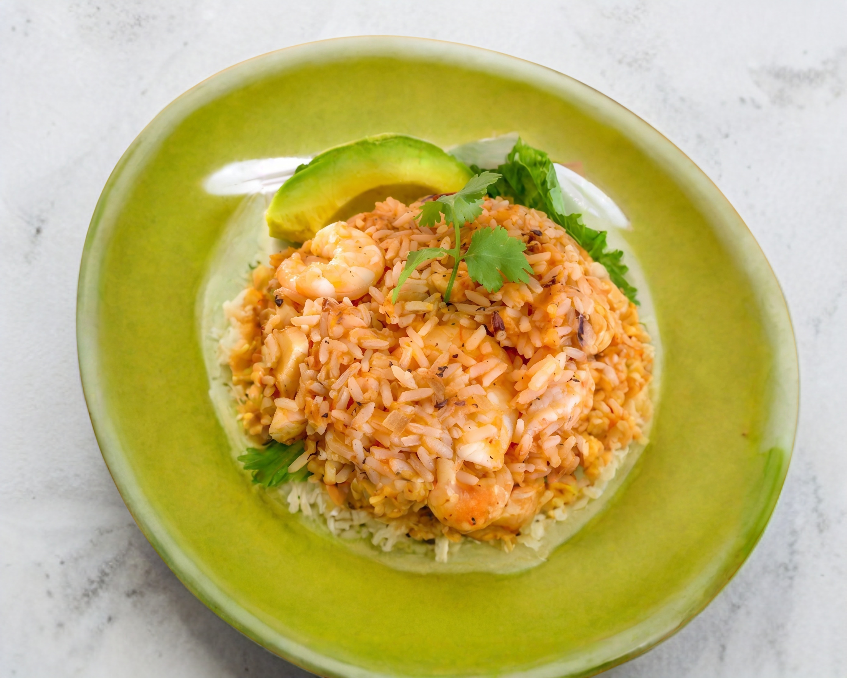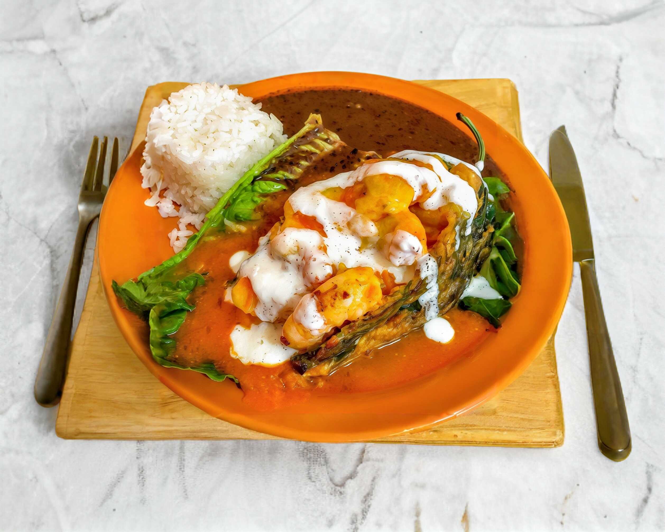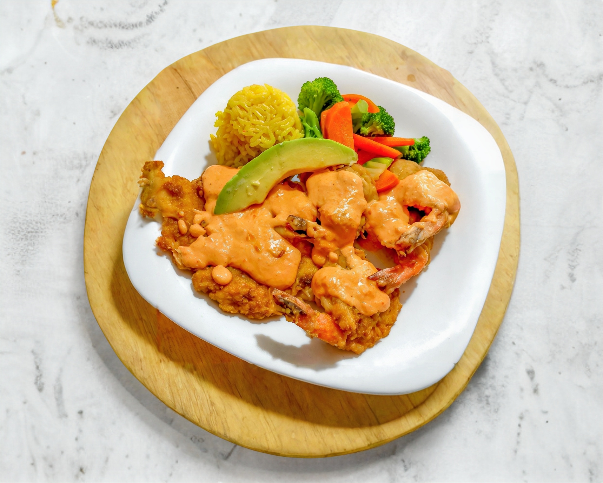 Nuestro exquisito filete de pescado fresco, empanizado y relleno de camarón, además de bañado en la salsa de queso de la casa.
