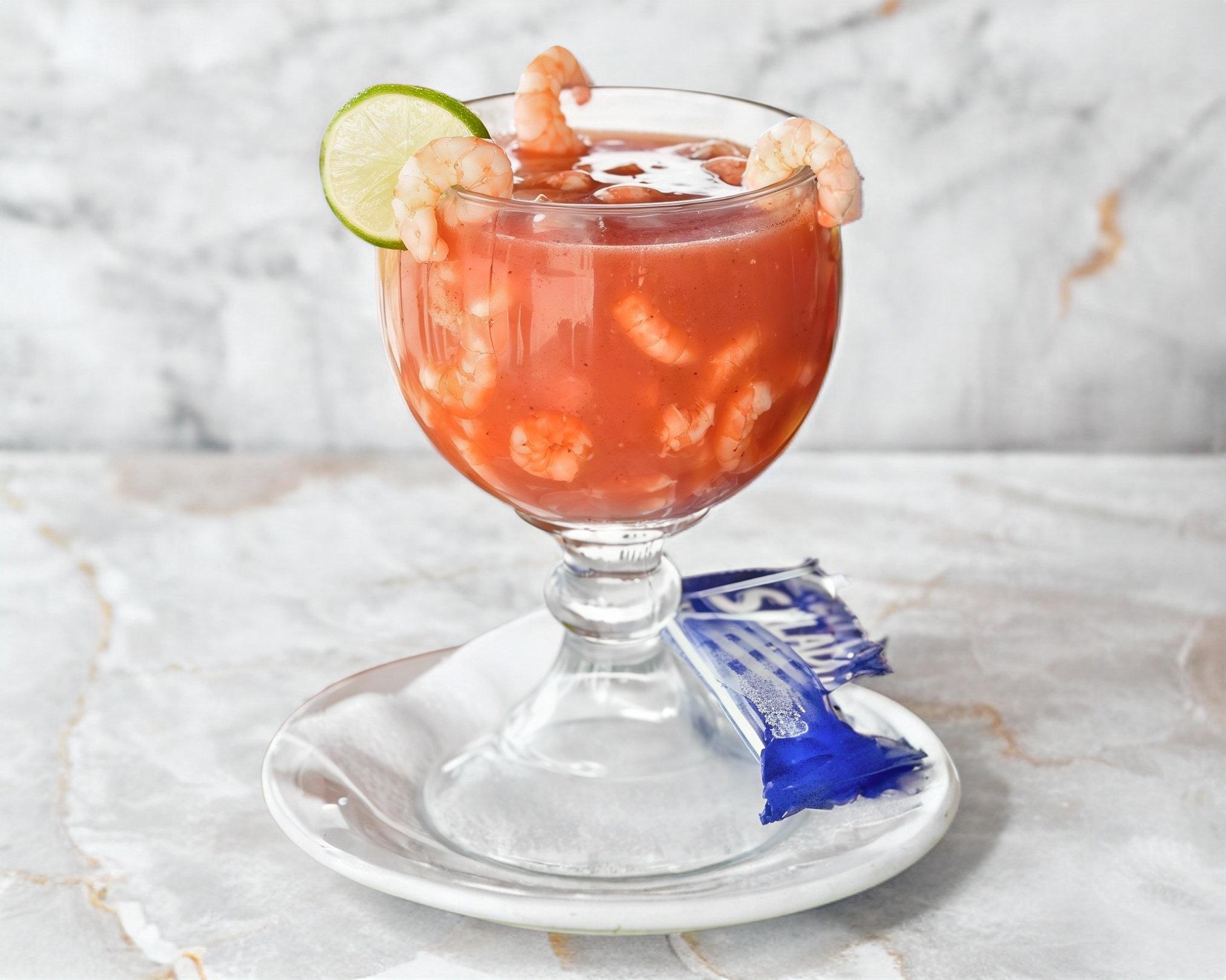 Coctel de camarón acompañado de totopos, cebolla, cilantro, salsa de habanero y limón
